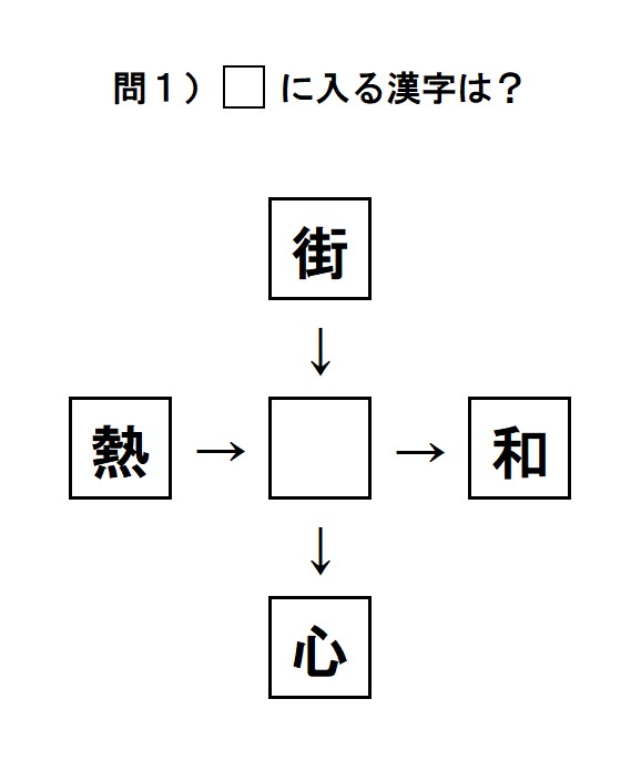 問1)正解は「中」または「街中」。熱中、中和、中心。