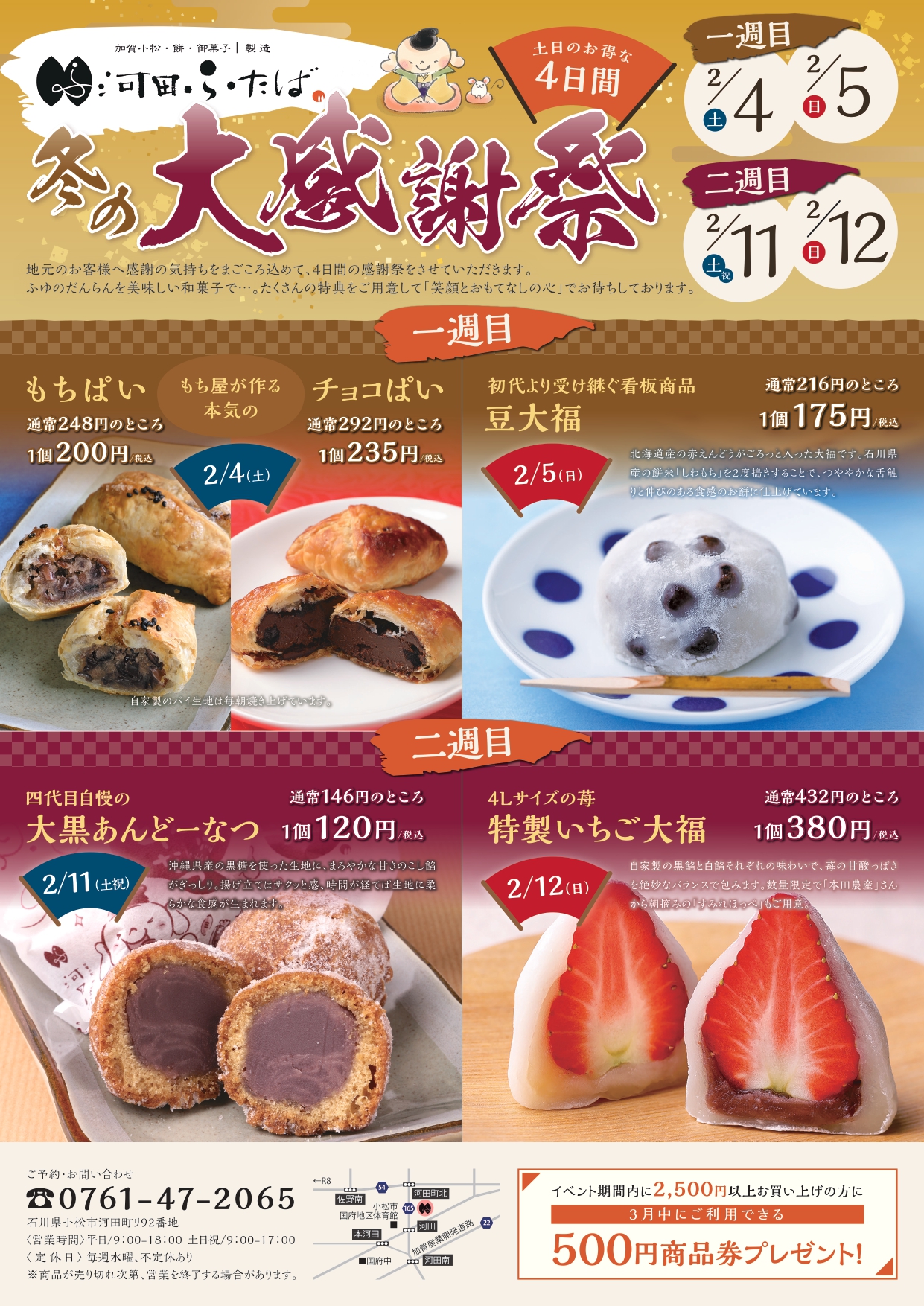 【2/4(土)•5(日)、2/11(土)•12(日)】 『河田ふたば』が「特製いちご大福」を販売する冬の感謝祭を開催。