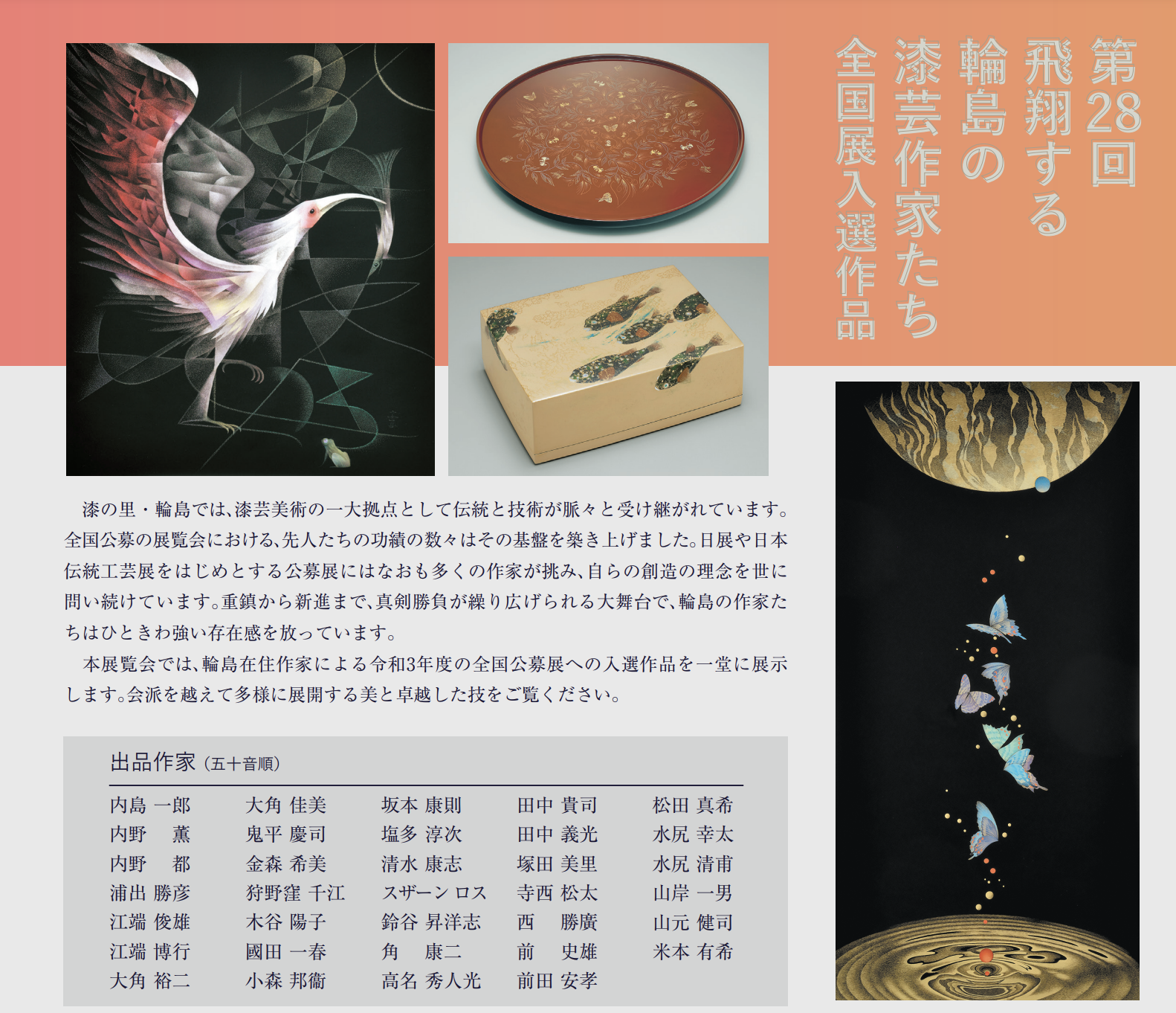 漆芸美術の一大拠点として伝統と技術が脈々と受け継がれる漆の里、輪島市。輪島の漆芸作家たちは数々の公募展で活躍し、その功績は今に続く輪島塗りの基盤を築き上げてきた。そんな輪島在住の作家による令和3年度の全国公募展への入選作品を展示した「第28回飛翔する輪島の漆芸作家たち-全国展入選作品-」が開催される。輪島の漆芸作家たちが様々な技法を駆使し表現する作品は見応えがあり、輪島の現代漆芸界が展望できる展覧会でもある。作家たちが創り出す美と卓抜な技を存分にご鑑賞いただきたい。