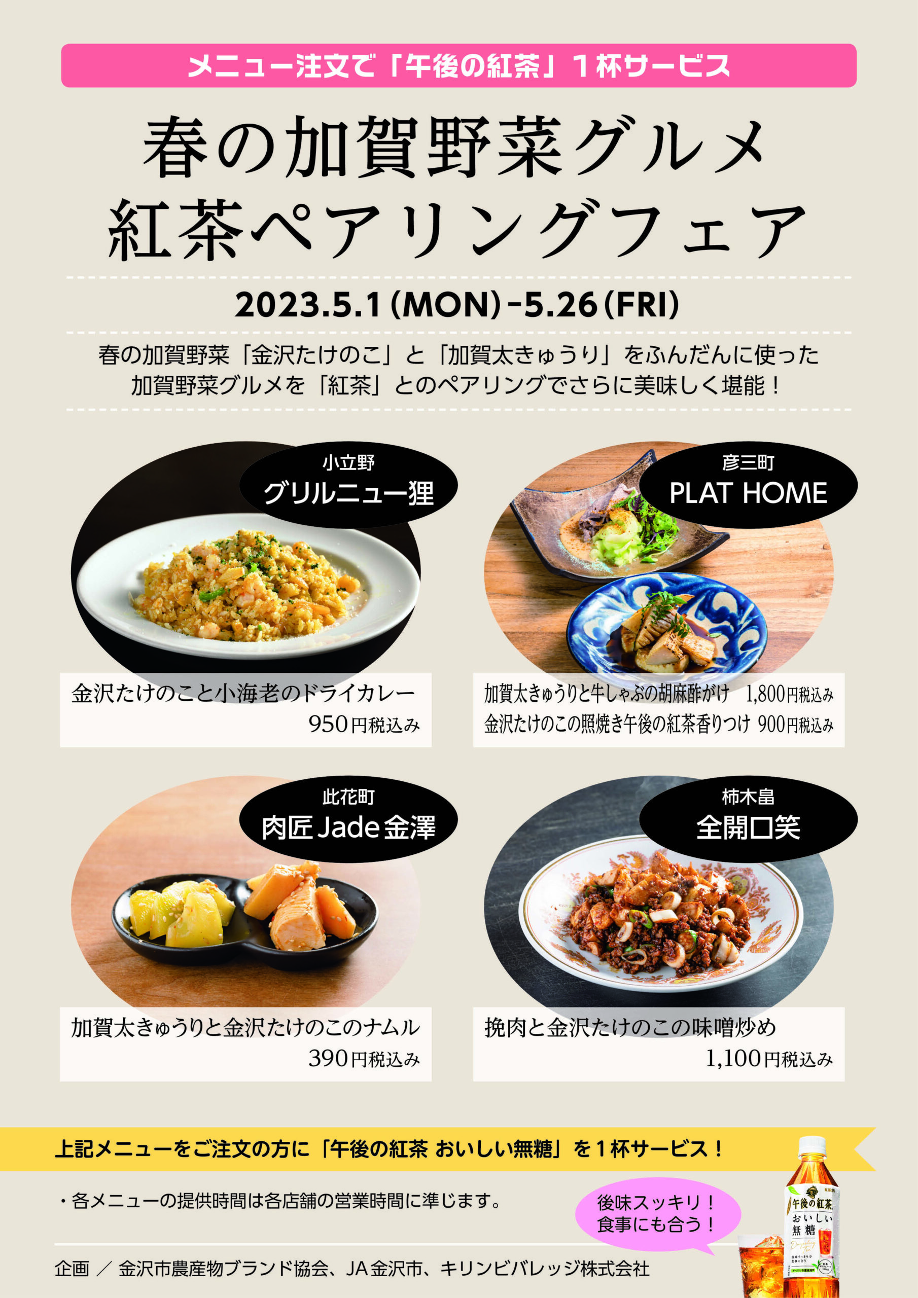 春の加賀野菜を使った和・洋・中・焼肉の創作グルメを注文すると「午後の紅茶・おいしい無糖紅茶」1杯サービス。美味しいペアリングはいかが。