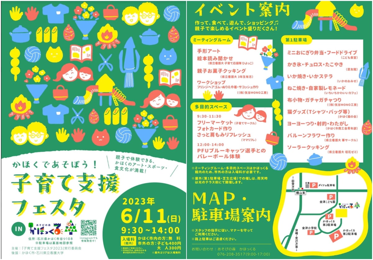 2023年6月11日(日)に『あそびの森かほっくる』にて、親子でアート、スポーツ、食を楽しめる「子育て支援フェスタinかほっくる」が開催される。会場となる第1駐車場はまさにお祭りの雰囲気。ミニおにぎり弁当、かき氷、チュロス、たこ焼き、いか焼き、自家製レモネードなどを楽しみつつ、ヨーヨーつりや射的、バルーンフラワー作りに挑戦できる。ミーティングルームでは手芸アートやワークショップを通してアートやカルチャーに触れられる。「石川県立看護大学 子育て応援隊 ひよっこ」による絵本読み聞かせや「石川県立大学」の3年生有志による親子お菓子クッキングにも注目だ。さらに、多目的スペースでは9:30〜11:30にフリーマーケットやフォトカード作り、さっと肩もみリフレッシュのイベントが行われ、12:00〜14:00にはPFUブルーキャッツの選手とのバレーボール体験が開催される。大人も子どもも盛り上がる楽しい一日になりそうだ。