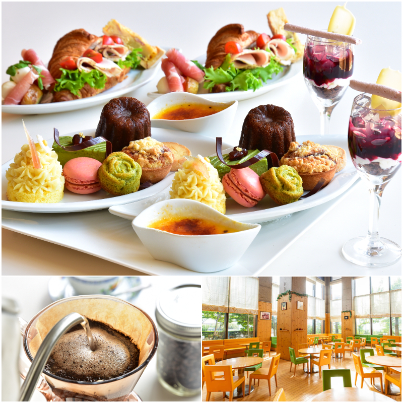 ホテルパティシエこだわりの能登ブルーベリータルトや五郎島金時モンブランなど地採れの果物や野菜を使ったプティフールの他、季節のスイーツや特製カヌレなどのアソートとなっている。セイボリーの能登豚ローストクロワッサンサンドは満足感があるので、軽めのランチにもぴったり。ドリンクはドリンクバーに加えて、ハンドドリップスペシャリティコーヒーとほうじ茶黒蜜ラテのどちらかが選べる。6月限定で、インスタグラムフォローをすると500円オフになる特典も用意。1階吹き抜けロビーの開放的な雰囲気の中、大きな窓から降り注ぐ、心地よい光を感じながら贅沢なティータイムはいかが。