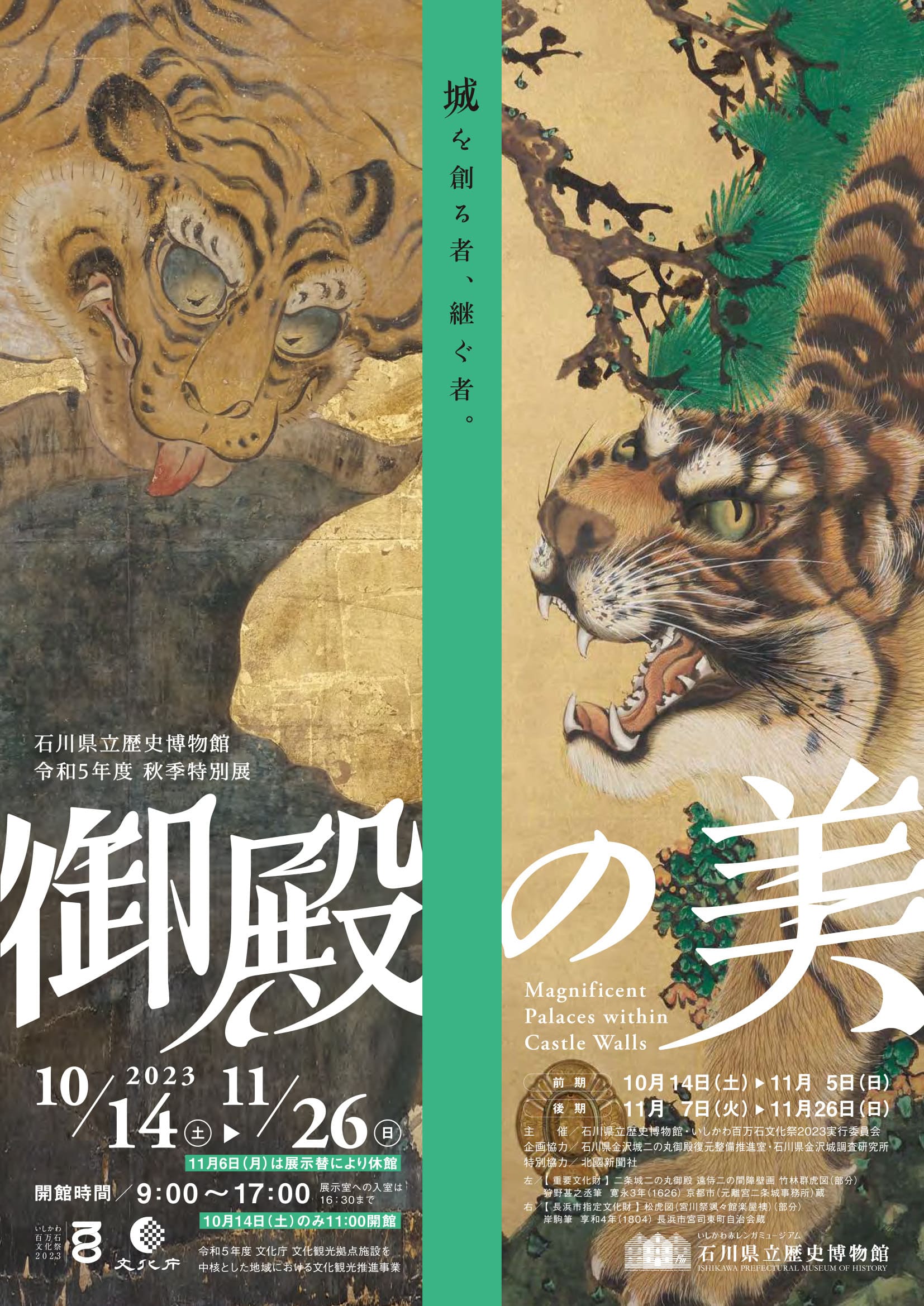 この特別展は、城郭御殿を巡る時の流れに着目し、その機能と美のあり方に迫るもの。石川県での展示は初めてとなる京都二条城二の丸御殿障壁画や、35年ぶりの展示となる名古屋城本丸御殿障壁画など貴重な資料が見られるまたとない機会だ。