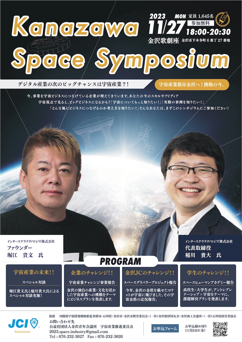 本シンポジウムの第1部は、本年度金沢青年会議所で実施した事業の報告を実施。第2部はスペシャル対談として、実業家の堀江貴文氏と、堀江氏がファウンダーを務める『インターステラテクノロジズ株式会社』代表取締役社長の稲川貴大氏を招き、これからの宇宙産業についての対談を行う。