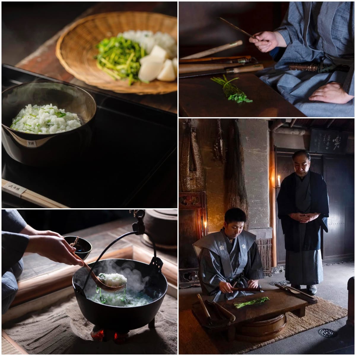 そんな大友楼で、旧暦1月6日の晩から7日の朝にかけて行うのが正月行事「七草行事」だ。これは病魔退散と春の縁起を祈り、独特の節まわしにのせて、7つの台所道具で七草をたたいてお粥にするというもの。かつては城下の家ごとに盛んに行われていた伝統行事を、今もそのままの形で継承しているのだという。