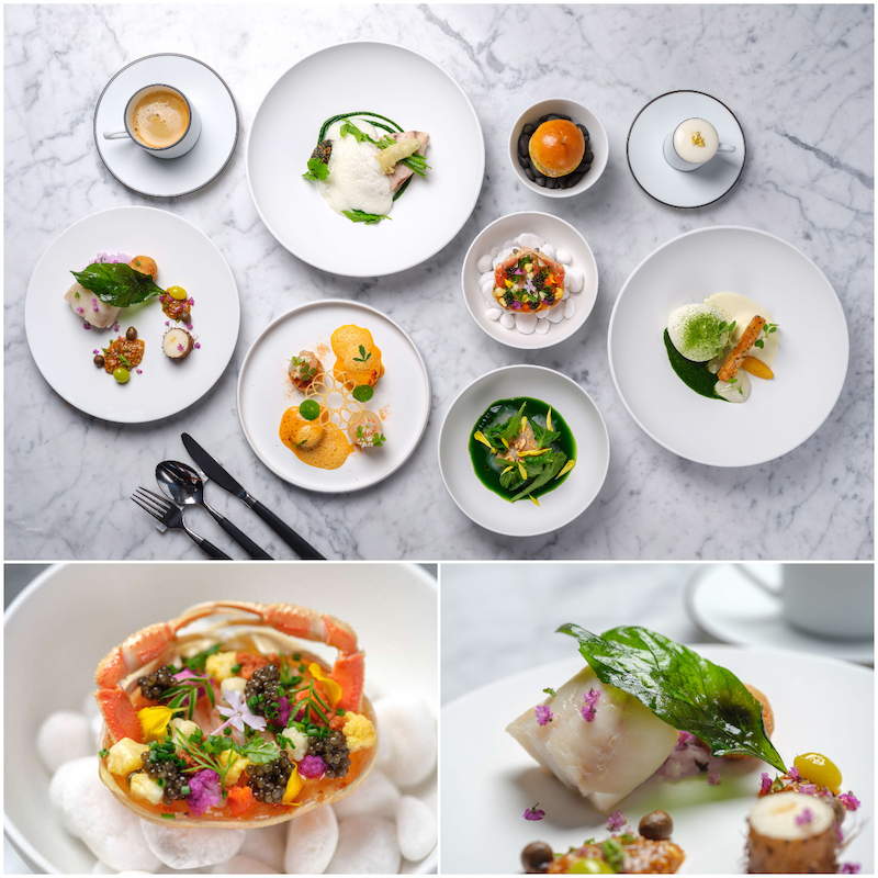 11月上旬から2ヵ月ほどの短い期間しか漁獲できない香箱ガニをはじめ、鰤、鱈白子、加賀野菜など、まさにこの時季が旬の金沢産食材をふんだんに取り入れた、総料理長 市塚 学氏のクリエイティビティが光るスペシャルメニューとなる。金沢を代表する味覚の香箱ガニは蟹身、粒々とした食感の外子と濃厚な旨味の内子すべてを贅沢に使いサラダ仕立てに。そのほかクセがなくとろりとした鱈白子を金沢春菊、加賀れんこんと合わせたムニエルや、甘海老と真鯛のクネルは源助だいこん餅と一緒に。