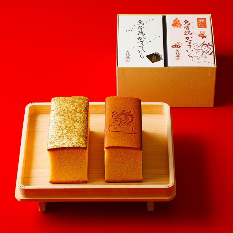 毎年楽しみにしている人も多いという人気の限定かすていらが登場した。職人が丁寧に焼き上げた「烏骨鶏かすていら プレーン」に、今年の干支である辰の焼印を刻印した特別バージョン「干支」と表面に金箔を施した豪華な「烏骨鶏かすていら」。これら2本をセットにした「烏骨鶏かすていら(干支・金)2本入りセット」は3,510円(税込)。12月26日(月)~12月31日(日)の到着を希望される場合は、お年賀特製掛け紙でのお届けとなる。