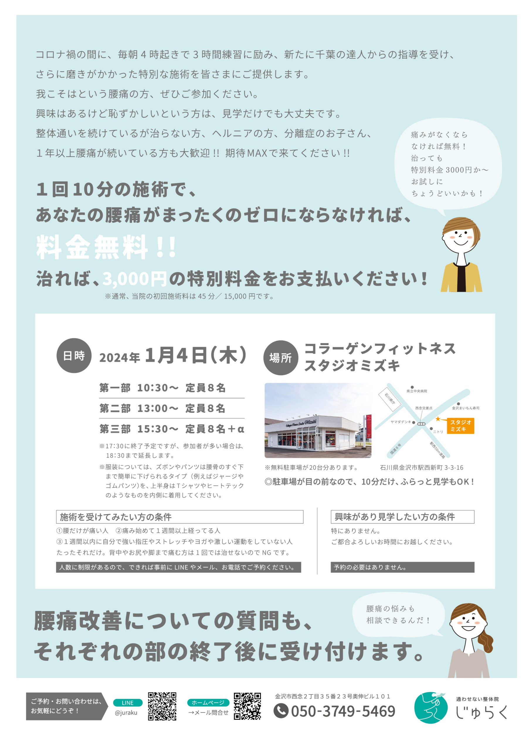 そんな『じゅらく』が2024年1月4日に公開施術会を開催する。通常15,000円の施術が、特別価格3,000円で体験できるまたとない機会だ。しかも、1回10分の施術で腰の痛みがゼロにならなければ、料金は無料! 痛みがなくなれば、特別価格3,000円を支払うというシステムなので、お試しには最適だ。施術を受けられるのは以下の条件をクリアした人。①腰「だけ」が痛い ②痛み始めて1週間以上経っている ③1週間以内に自分で強い指圧やストレッチ、ヨガ、激しい運動をしていない この3点をクリアした人だ。背中やお尻、脚まで痛む人は1回では治せないので注意が必要。気になる人は見学のみでも参加可能だ。今回の公開施術会は、通常の店舗ではなくレンタルスペースで行うので、詳細を知りたい人は下記をよくチェックしよう。
