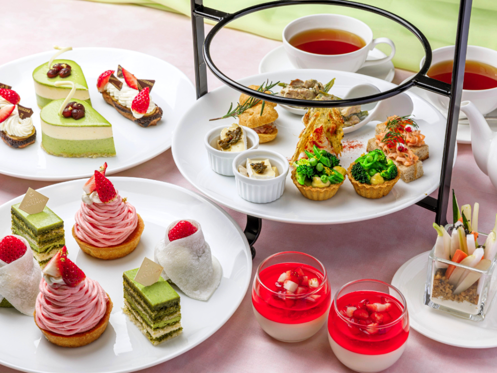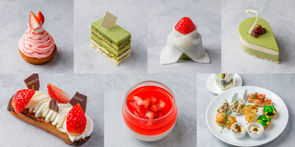 スイーツは全6種。タルト生地にカスタードといちごのジュレを重ね、桜色のいちごクリームを絞った「いちごのモンブラン」、抹茶の風味豊かなジョコンドと上品な甘さのクリームが調和する「抹茶のオペラ」、求肥を巻いた和菓子のような食感の「いちごと抹茶のロールケーキ」など、バラエティ豊かな味わいが楽しめる。さらに、「いちごとティラミスのエクレール」、「抹茶とホワイトチョコレートのムース」、「いちごのゼリーとパンナコッタ」などもラインアップ。