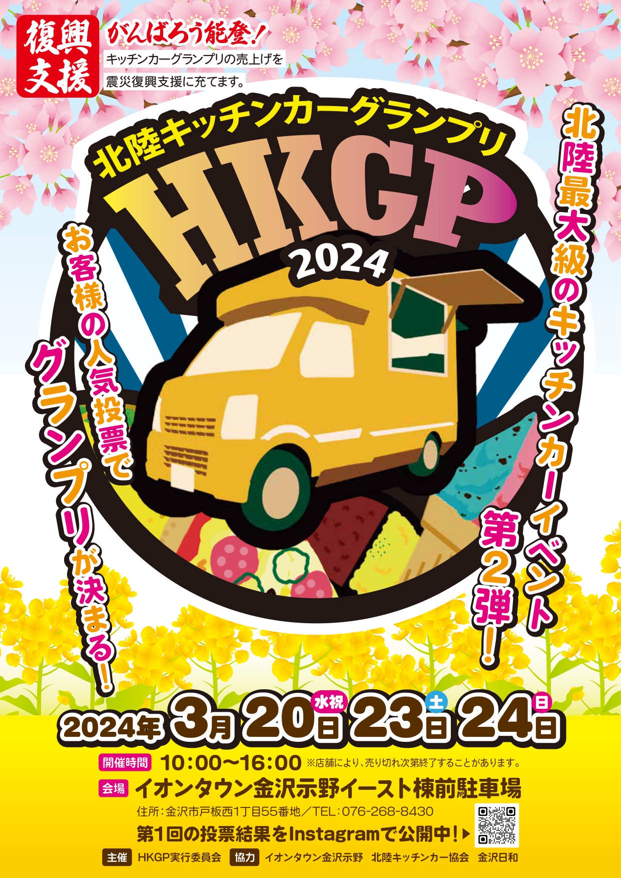 昨年の7月に開催して好評だった「北陸キッチンカーグランプリ」の第2弾が、3月20日(水・祝)、23日(土)24日(日)の3日間、イオンタウン金沢示野イースト棟前駐車場で開催される。北陸で活動する人気のキッチンカーが金沢に集結するこのイベントは、来場者の人気投票でグランプリが決まるとあって、出店者と来場者の熱気の高さが特徴。前回入賞したキッチンカーも含め57店舗が出店するので、今回も期待がふくらむ。お腹いっぱい食べたくなるご飯やパン、別腹でいくつも食べたくなるスイーツやドリンクなど、悩む楽しみも同時に味わえそうだ。寒さが和らぐ3月下旬は、お出かけしたくなる時期。余裕のある3日間の開催なので、スケジュールを調整して家族や友人、カップルで出かけてみてはどうだろうか。なお、今回のキッチンカーグランプリの売上の一部は能登半島地震の復興支援に充てるとのこと。おいしく食べることが支援につながるイベントだ。3日間のうち、1日もしくは2日間のみ出店する店のリストは下記へ。お気に入りキッチンカーがあったらぜひ、足を運んでみては。
