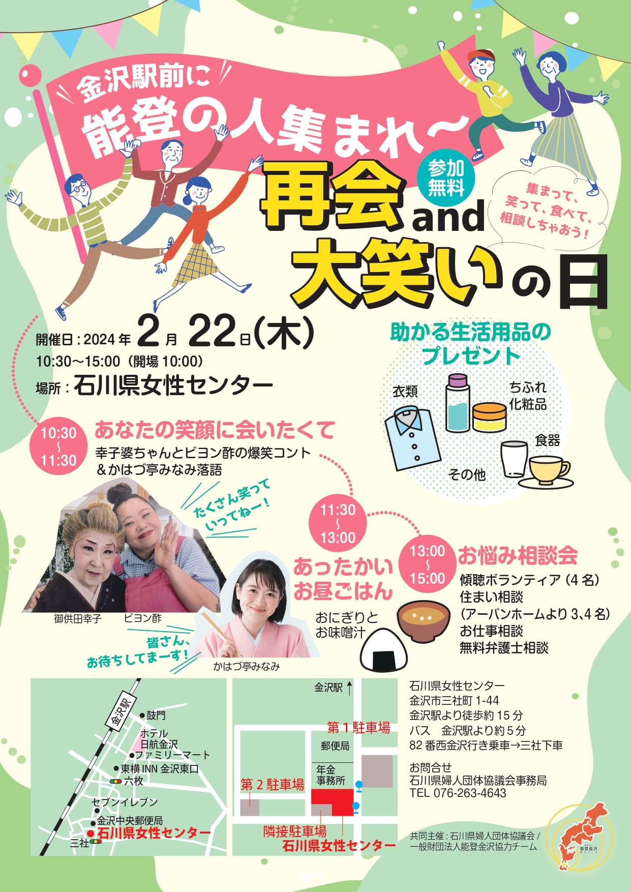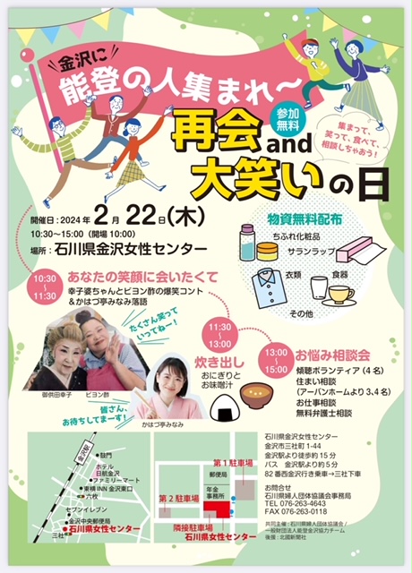 2月22日(木・祝前日)、金沢駅から徒歩10分の『石川県女性センター』で、能登半島地震で被災された方に向けたイベントが開催される。当日は「あなたの笑顔に会いたくて」をテーマに、御供田幸子さんのお馴染み『婆ちゃんコント』にタレントのビヨン酢さんが相方を務める爆笑コントが披露されるほか、かはづ亭みなみさんの落語も楽しめる。また、11時半からは、おいしくて温かいお味噌汁とおにぎりでほっこりタイムも。