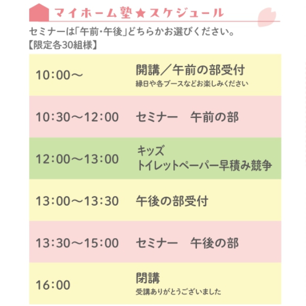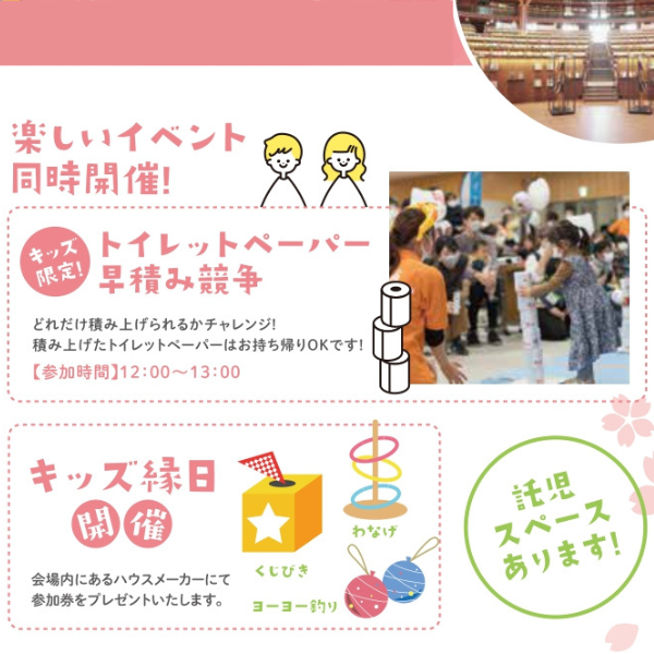 「マイホーム塾」の人気の理由は、わかりやすいと評判のセミナー内容に加え、親子で一緒に楽しく参加できるイベントが多い点。輪投げやヨーヨー釣りなどが楽しめるキッズ縁日コーナーや託児スペースを設置され、キッズ限定の「トイレットペーパー早積み大会」は、積み上げた分のトイレットペーパーは持ち帰りOKとあって毎回大盛りあがり! 住宅メーカーのブースを回るスタンプラリー(優先参加)では、ガラポン抽選で豪華商品をゲットできるチャンス。夫婦で参加した人にはもれなく「2,000円分のamazonギフト券」など、今回も来場者プレゼント満載だ。
