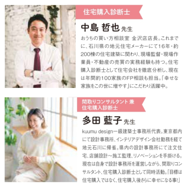 セミナー講師は『おうちの買い方相談室』の金沢店店長で年間約100家族のFP相談を担当する、住宅購入診断士の中島哲也さんと、「住宅購入後さらに幸せになること」を目標に掲げる、間取りコンサルタント兼住宅購入診断士の多田藍子さんが中心となっている。「後悔しない住宅づくりの進め方」「今だから選ぶべき住宅ローン」「地震に強い家の耐震性基準」「自分たちに合った住宅会社選び」「住宅購入者が始めるべき資産形成」の家づくりにおいて大切な5つのポイントを教えてくれる。