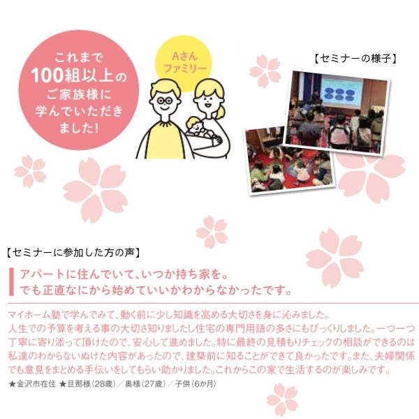 これまで参加した100組以上の家族からは「家づくりは何からはじめればいいかわかった」「実際に動く前に、知識を得ておく大切さや人生全体での予算を考える事の大切さを知った」「最終の見積もり相談で、自分たちでは気付けないことを教えてくれたので助かった」「押し売りなどなく安心して話が聞けた」と好評の声が相次いでいる。今回のテーマは「マイホームを建てる前に学ぶ重要性〜 今選ぶべき住宅ローン〜」。気になりつつも、誰に聞けばわからない住宅ローンについて学ぶことができる。