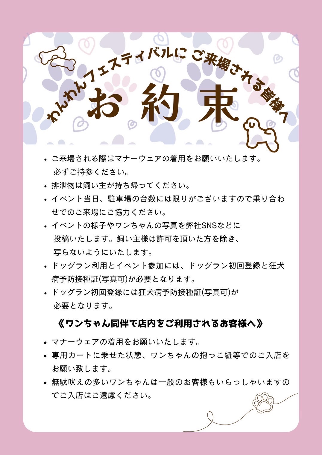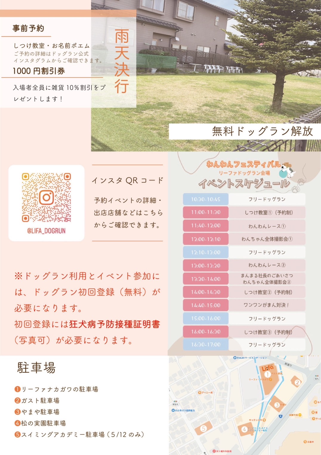 ※近隣の方のご迷惑になりますので、路上駐車や上記施設以外への駐車はしないでください。第1回わんわんフェスティバル