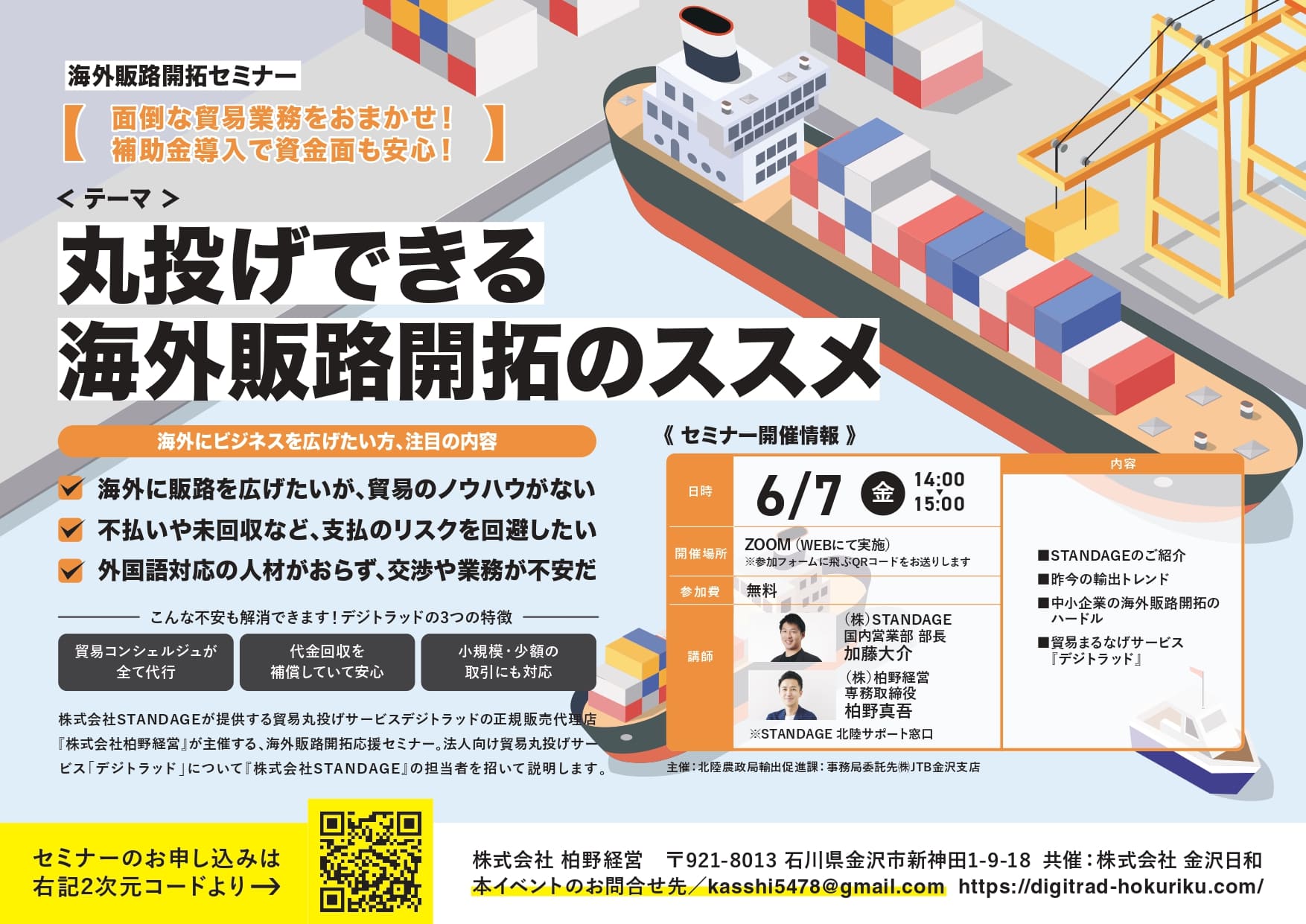 2024年6月7日(金)、Zoomを使った海外販路開拓のオンラインセミナーが開催される。テーマは「丸投げできる海外販路開拓のススメ」。株式会社STANDAGEが提供する貿易丸投げサービス「デジトラッド」の正規販売代理店である『株式会社柏野経営』が主催し、昨今の輸出トレンドや中小企業の海外販路開拓のハードルについて解説。株式会社STANDAGEの担当者にオンラインで直接質問できる機会を設ける。