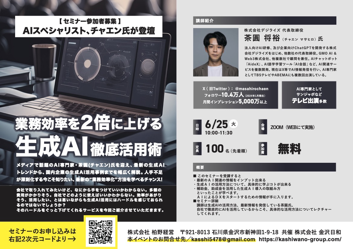 メディアで話題のAIスペシャリスト・茶圓(チャエン)氏が登壇するセミナー「業務効率を2倍に上げる生成AI徹底活用術」をオンラインにて開催。茶圓 将裕( チャエン マサヒロ)氏といえば、法人向けAI研修、及び企業向けChatGPTを開発する『株式会社デジライズ』をはじめとする数社の代表取締役を務めており、GMO AI &Web3株式会社、他複数社で顧問を兼任。AIチャットボット「AideX」、AI語学学習ツール「AI会話」など、AI関連サービスなど複数を開発。現在はX等でAI情報発信を行い、AI専門家としてTBSテレビやABEMAにも複数回出演している。