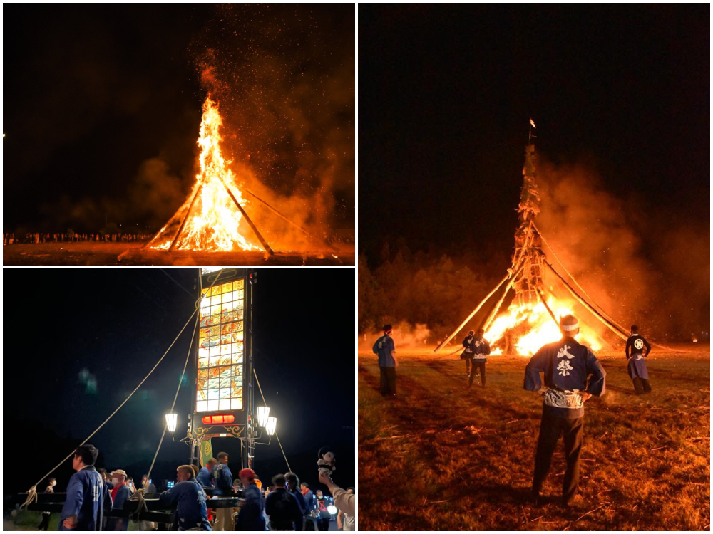 毎年7月の最終土曜日に行われる夏祭りで石川県の指定無形民俗文化財の一つ。「日本三大火祭」の一つにも数えられている「向田の火祭」は、能登島向田町に鎮座する伊夜比咩神社の夏祭り。約30メートルにもなる巨大な柱松明はこの祭りのシンボルだ。地元の住民から観光客まで男女問わず手松明を振りながら、柱松明の周りを歩き、合図と共に一斉に手松明を投げつけ点火。巨大な柱松明が火柱となって燃え盛る様子は圧巻だ。その大松明が燃えつき、倒れた方向によってその年の豊漁、豊作を占うという。また、柱松明の先につけられている御幣を取ったものは延命息災が叶うと言われている。島民総出で準備し、次世代への繋いでいく伝統ある祭り。