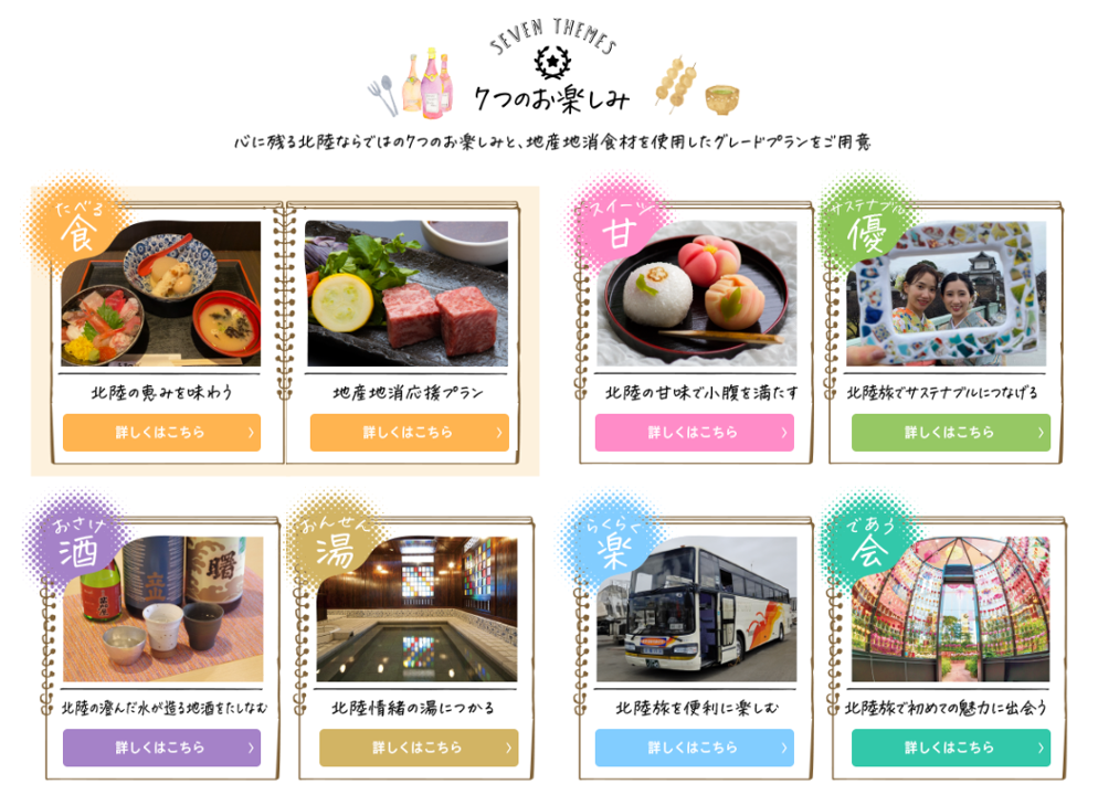 「まだ見ぬ新しい春夏の北陸」をクローズアップし、「北陸ならでは」の独創的な祭りや地域の魅力を紹介しながら、北陸での様々な旅の過ごし方を提案する同サイト。「食」「甘」「優」「酒」「湯」「楽」「会」といった、心に残る北陸ならではの「7つのお楽しみ」を中心に、地産地消食材を使用したグレードプランを用意している。また、日本の旬北陸の期間中、旅の寄り道券2000円クーポン付(通常500円)とお得になっているプランも実施している。旅の寄り道券付きプランはこちら>>