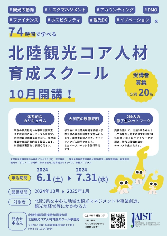 国立大学法人北陸先端科学技術大学院大学 (JAIST)では、2024年10月から2025年1月にかけて開講する「北陸観光コア人材育成スクール」の受講生を募集している。こちらのスクールは、次世代の観光をリードする地域の観光イノベーション推進人材の育成を目指しており、同学のリスキル・リカレント教育センターの敷田麻美教授が担当する。