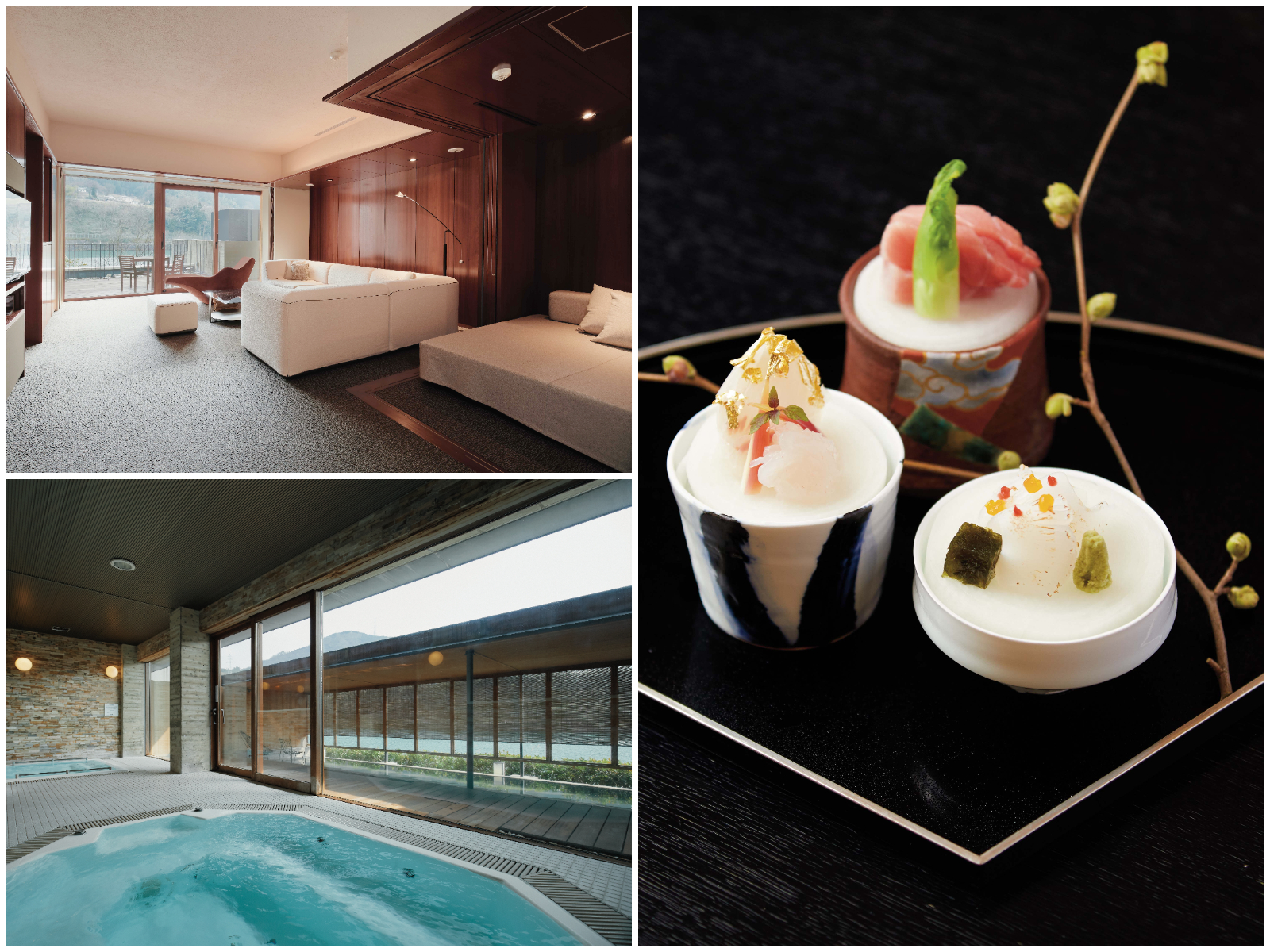 左上/新館ラグジュアリースイート 温泉付【111号室】「恋華の間」。深みのある赤が美しいカリン材を使用した優美な空間。左下/宿泊者専用スパ。広々としたジャグジーバスやサウナ、露天風呂、仕切りつきのパウダールームなどを備えた贅沢なしつらえ。右/和彩膳所『樂味』和懐石(18,150円)メニューの一例。季節を彩る地元富山の食材と、こだわりぬいた器の饗宴に心躍る。