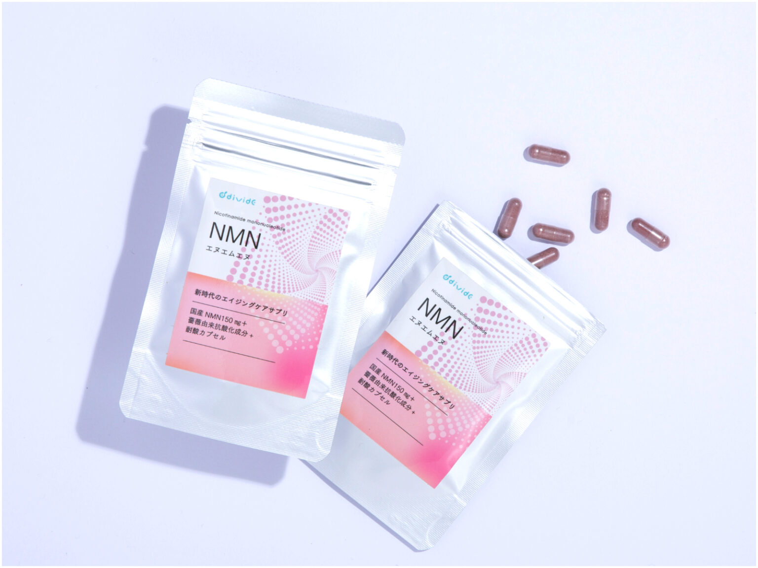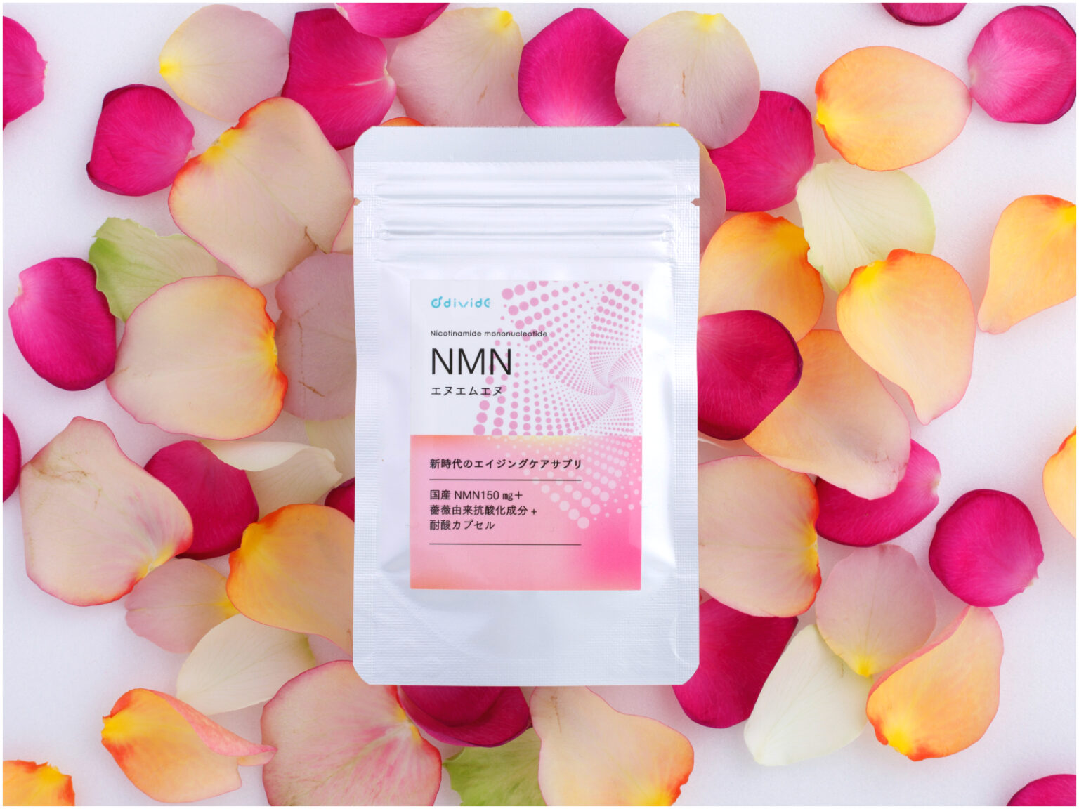NMNはNHKのTV番組でも取り上げられたほどで、今、美容業界が注目する成分。「dividE(ディバイド)」のβ-NMN(β型ニコチンアミド・モノヌクレオチド)は、国産原料にこだわり、効果を期待できる分量をしっかりと配合しつつも、良心的な価格が魅力。またアレルギーケアや美白美容、メタボケアに効果があると言われるバラの花びらの抽出成分も添加しているという。