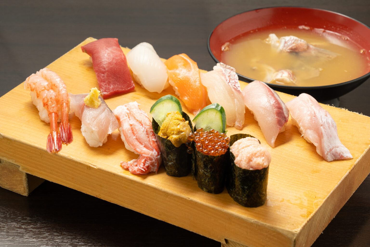 同じ近江町市場内の『大口水産』や『新力水産』などの水産業者と太いパイプを持っており、プロが目利きしたネタはどれも鮮度抜群。甘えびやがすえび、能登産ふぐ、白海老といった北陸産の旬魚はもちろん、ウニやいくら、生マグロなど全国各地のおすすめのネタを揃えており、店舗の広さから想像できないほどの豊富な品揃えにも驚かされる。なお、のどぐろやマグロ、ブリなど、日によって内容が変わる旨みたっぷりの「あら汁」は、多くの魚を捌く同店ならではの豪華さ。一見さんや観光客も温かく迎えてくれる人情味にあふれた接客も、リピーター続出の理由だろう。