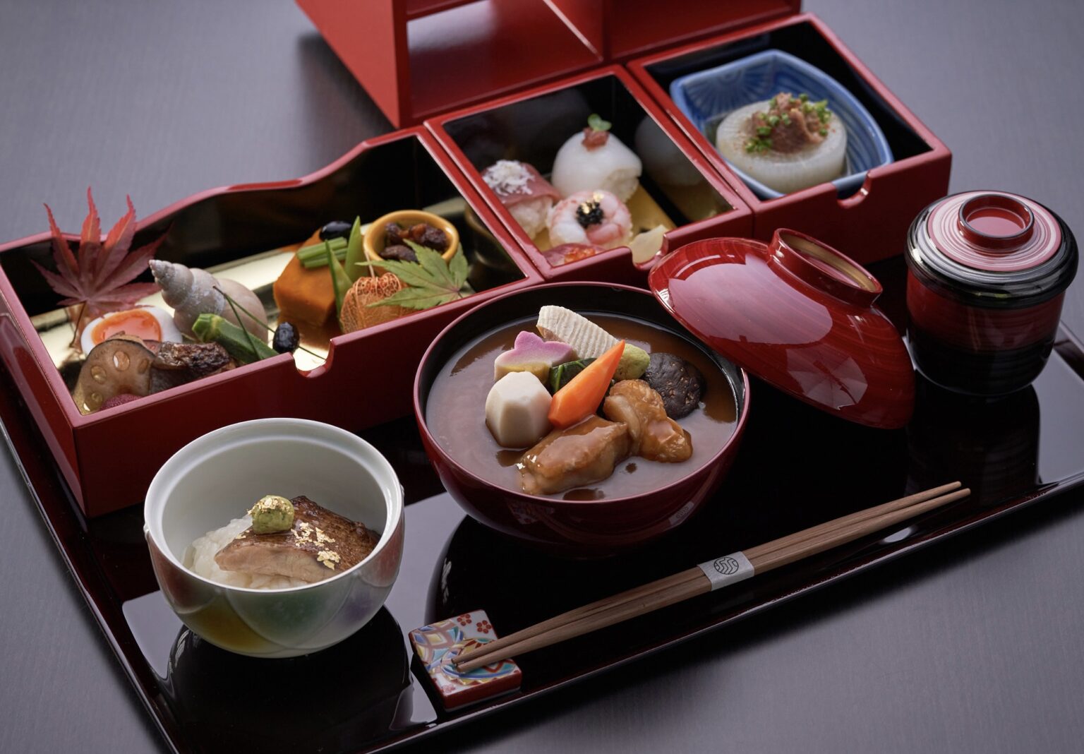 朱塗りの美しい箱はかつての御殿様の園遊弁当をイメージ。加賀てまりをイメージしたかわいい手まり寿司や、旨味たっぷりの牛すじ大根や上質な脂身がのった高級魚「のど黒」の蒸し寿司は最上級の美味しさ。※要予約(仕入状況により内容の変更あり)