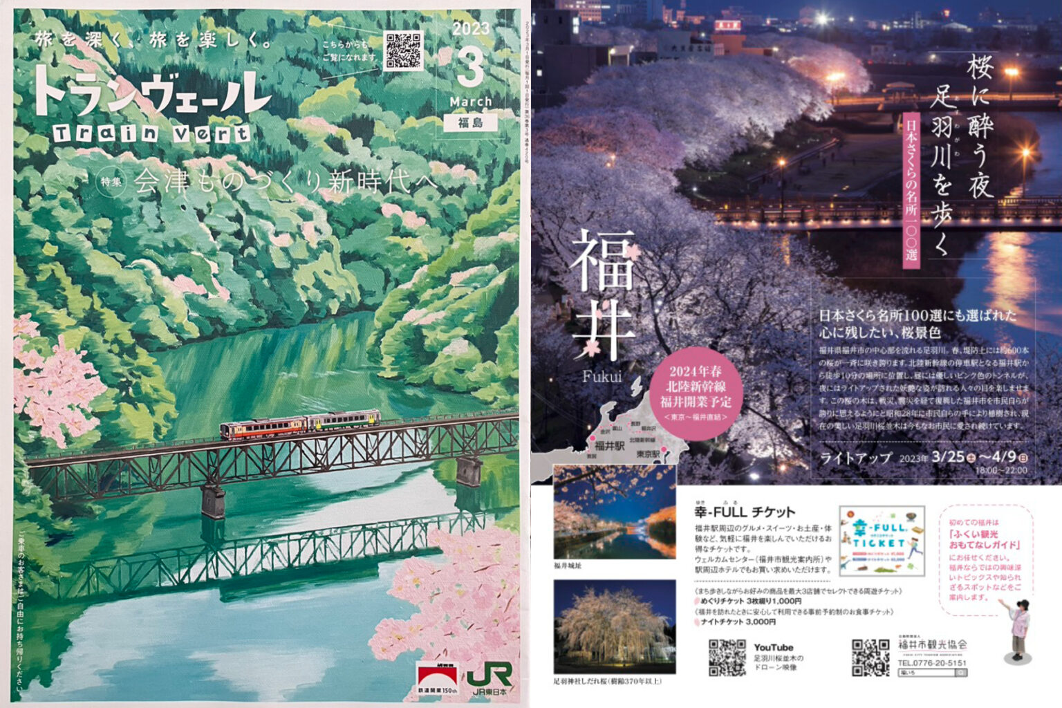 日本さくら名所100選にも選ばれた、福井県福井市•足羽川沿いの桜並木。昼には優しいピンク色のトンネルが、夜にはライトアップされた妖艶な姿が訪れる人の目を楽しませます。『福井市観光協会』は、2024年春の北陸新幹線・金沢-敦賀間延伸も視野に入れて、関東方面からも多くの観光客が訪れてほしいと、JR東日本が発行する新幹線車内サービス誌『トランヴェール』に広告掲載を決定。上質なものを知る大人に向けて、福井市の桜の魅力が伝わる誌面にしたいと希望されておりました。