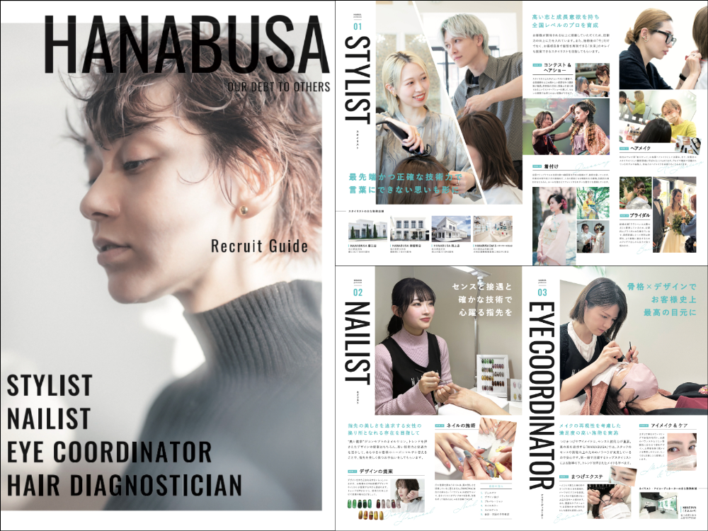「雑誌のようなすっきりとシンプルなデザインを」というご希望に合わせ、視認性と目線誘導を意識しつつも、男女どちらも手にとりやすい中性的なエディトリアルデザインに。HANABUSA様は業務が細分化されているトータルビューティーサロンのため、冊子を読んだ学生さんが入社後の自分自身をイメージしやすいよう、スタイリスト・ネイリスト・アイコーディネーター・毛髪診断士®の業務内容を写真と文章でしっかりと表現しました。