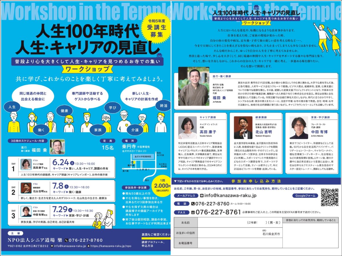 まず、ワークショップ『人生100年時代 人生・キャリアの見直し』の配布用チラシを作成。ターゲット層である50代以上のアクティブシニアを意識し、色彩とフォントでメリハリをつけ、ビジネスユーザーに刺さるデザインに。また、視認性を高めるためにフォントは大きめを心がけました。尚、金沢日和では、地元の方々に向けて同ワークショップのイベント記事を掲載。さらに、お寺でのワークショップという珍しい取り組みを発信するため、プレスリリース配信サービス「@Press」を用いて県内外のメディアにもPRを行いました。