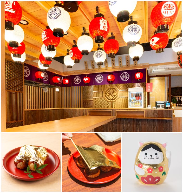 『箔座 金の縁起屋』は、金箔が本来持つ縁起のよさを見て食べて感じて楽しめるコンセプトショップ。目玉は、金箔を一枚ふわりのせた縁起のよいたこ焼き「金沢たこ焼 松」。金箔をのせるところを動画で撮影する人も多く、SNS向きと人気だ。生地に旨味と香りが際立つ天然だしを使用したこだわりの味。金箔は食用としてより安心な「縁付金箔」のみを使っている。この金箔は国宝の修復などに使われる伝統的な製法の金箔で、店内の天井などにも施されている。金沢のビール職人によるクラフトビールや、加賀の柚子を使ったレモネードなどたこ焼きと一緒に楽しめる地元産のドリンクも人気。他にも、金箔張り子「福ねこ」や「金の開運守り」など、お土産に持って帰りたいオリジナルの縁起物が揃っている。