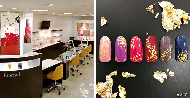 『エターナル』は近江町市場向いの百貨店『金沢エムザ』の2階にある実績豊富なサロン。「金沢の伝統工芸の一つ金箔で、旅の思い出にネイルを」という人が増えていて、施術後5分で乾く金箔ネイルが好評。足の疲れた人にはフットケアもおすすめ。