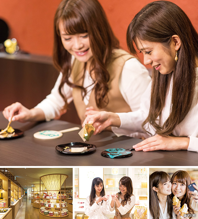 上/金箔体験も豊富。下左・中/金箔専門ショップ。サンプル品も多くお試しも充実。下右/金箔ソフトも人気。