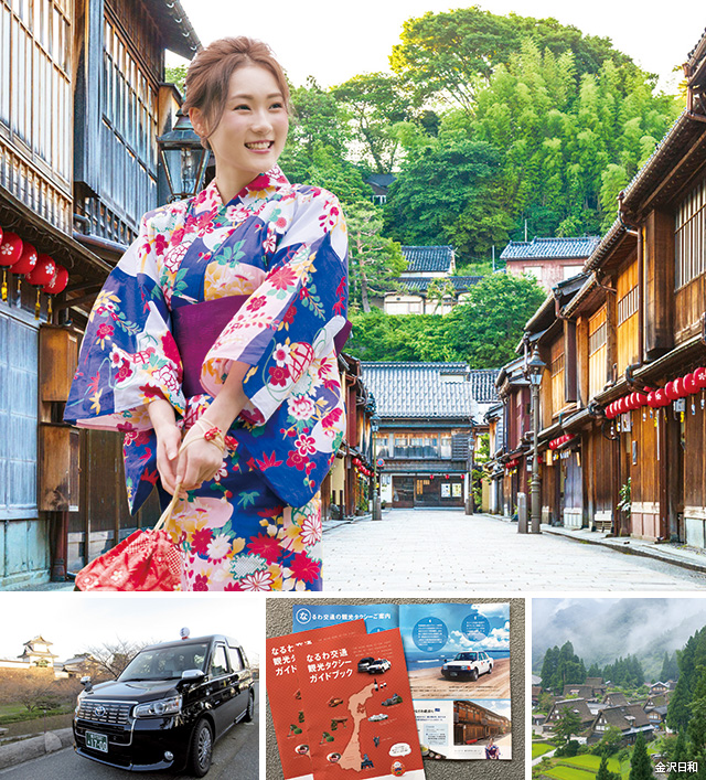 観光地をタクシーに乗って巡る小旅行が人気だ。『なるわ交通』はその観光タクシーのトップクラス会社。観光ガイド認定の乗務員を揃え、金沢を拠点に飛騨、富山、能登、石川、福井に観光タクシーを走らせている。人気の秘密は、金沢駅を起点にして市内全域にオリジナルコースを多彩に用意していること。例えば、発酵文化を訪ねる金沢蔵巡りや、金沢B級グルメ巡りなどがユニーク。特に、空いた時間を有効に活かす2時間コースが今、大人気だ。金沢駅あるいはホテルから出発する。もちろん定番観光地を巡るコースも潤沢に設定されている。また、岐阜から福井までの広域でも、日帰りコースなどを数多く用意しており、飛騨高山、能登半島、東尋坊など金沢起点のタクシーの旅を楽しめる。