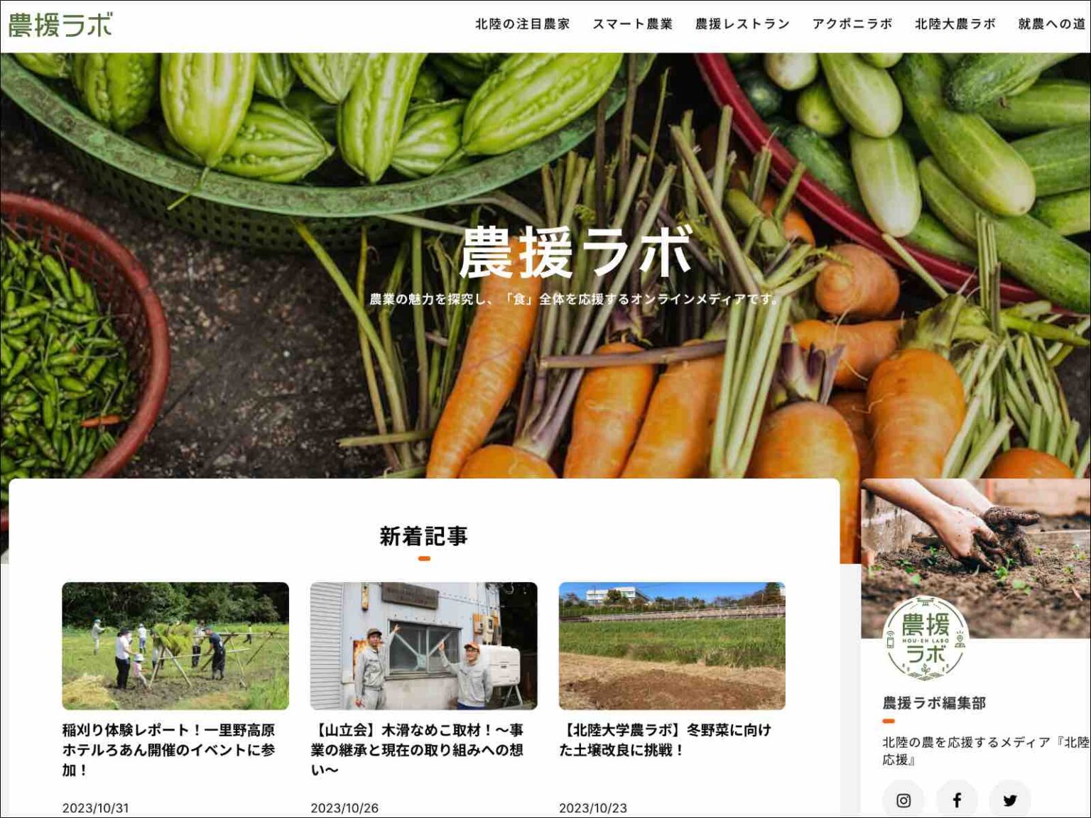 これまで別のサイトに書き溜められていた取材記事類を整理・分類。元々あった情報を軸に、農業×北陸×テクノロジーのコンセプトに沿ったオウンドメディア「農援ラボ」を企画・制作し、メディアとしての個性を見える化。また、石川県内の農業従事者に、必要で役立つ情報をお届けするため、記事作成にも参加。北菱電興の社員の方と協力して、新しい取り組みを行っている地元の農業従事者に取材・撮影を行い、記事を定期作成しています。