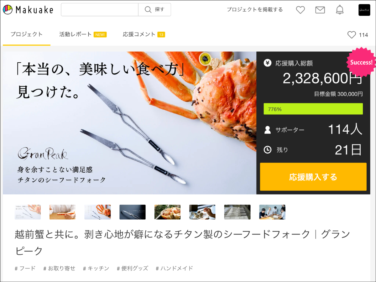 紹介した商品、シーフードフォーク「グランピーク」は、龍泉刃物、望洋楼に加え、実際の制作にはメガネ加工技術で有名なチタンクリエーター福井の3社がタッグを組み完成。福井県の魅力が融合したプロジェクトであること、作り手のこだわり、使用シーン、越前蟹とのセット商品の紹介、と伝えたい情報が多かったため、読み手に届きやすいように、ほしいと思っていただけるように情報を整理。ブランドの世界観を大切にしながら、トンマナを決定し、必要な写真などの提案もさせていただき流れを構成しました。プロジェクトは初日半日を待たずに100万円、2日目には200万円を達成し、今も好反応を得ています。