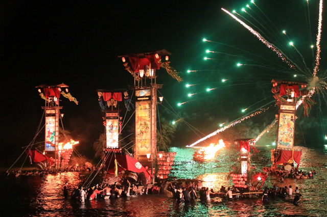 忌火が松明へと移され、温泉が運ばれ火入れ・湯入りの儀式が行われるところからスタート。色とりどりの花をあしらった大きな笠をまとい、腰鼓や編木をつけて躍る人々、アクロバット、ジャグリング等様々なパフォーマンスが中世の絵巻物さながらに華やかに繰り広げられる。