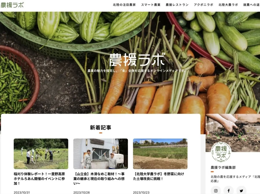 これまで別のサイトに書き溜められていた取材記事類を整理・分類。元々あった情報を軸に、農業×北陸×テクノロジーのコンセプトに沿ったオウンドメディア「農援ラボ」を企画・制作し、メディアとしての個性を見える化。また、石川県内の農業従事者に、必要で役立つ情報をお届けするため、記事作成にも参加。