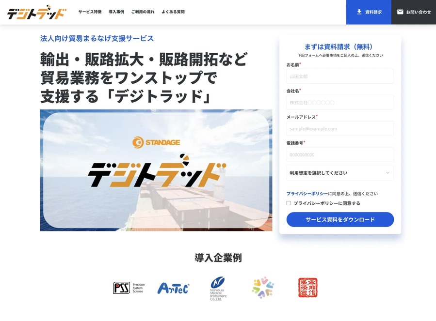 株式会社STANDAGE様が提供する法人向け貿易丸投げサービス「デジトラッド」。海外販路拡大のノウハウを有する同社が販売先開拓から交渉契約までを丸ごと代行、代金回収まで補償するという画期的なサービスとして話題を集めています。そんなデジトラッドの正規販売代理店となられた株式会社柏野経営様より、北陸エリアを中心とした顧客の方々に解りやすくサービス紹介できるLPを短期間で制作したいとご依頼いただきました。