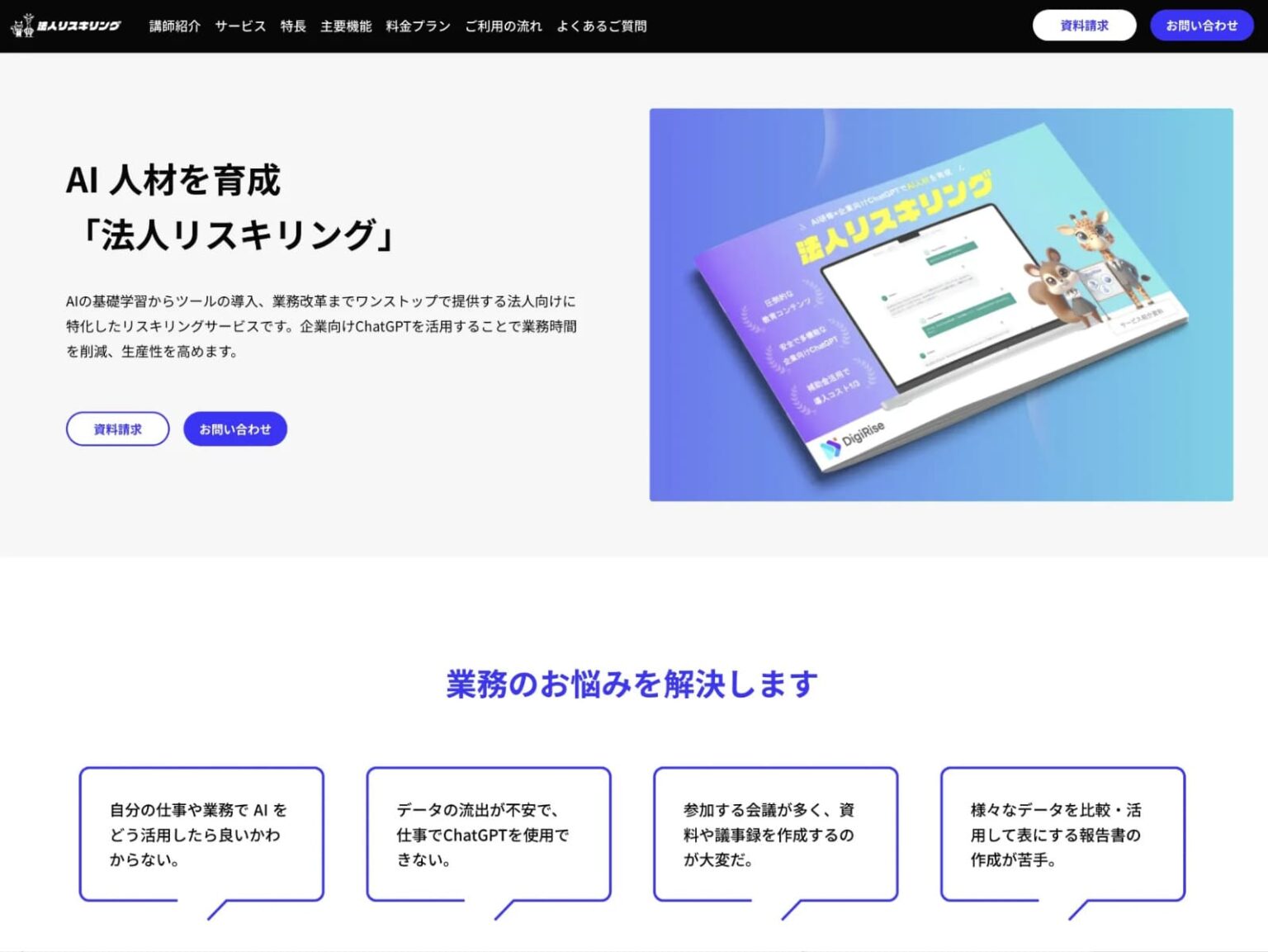 金沢市内の『株式会社チェンジプロモート(柏野経営グループ)』様は、起業や海外展開など、企業のお悩みに寄り添ったサービスを提供している会計事務所です。今回、企業の業務効率向上という課題解決の提案策として、これからの時代に必要なAI人材の育成に特化したサービス「法人リスキリング」を『株式会社DigRise(デジライズ)』と提携して提供することに。今後、北陸で当サービスを広めていくため、基本的なサービス内容の紹介や料金、お問合せなどの機能を備えたホームページを短時間で作成することが目下の課題でした。