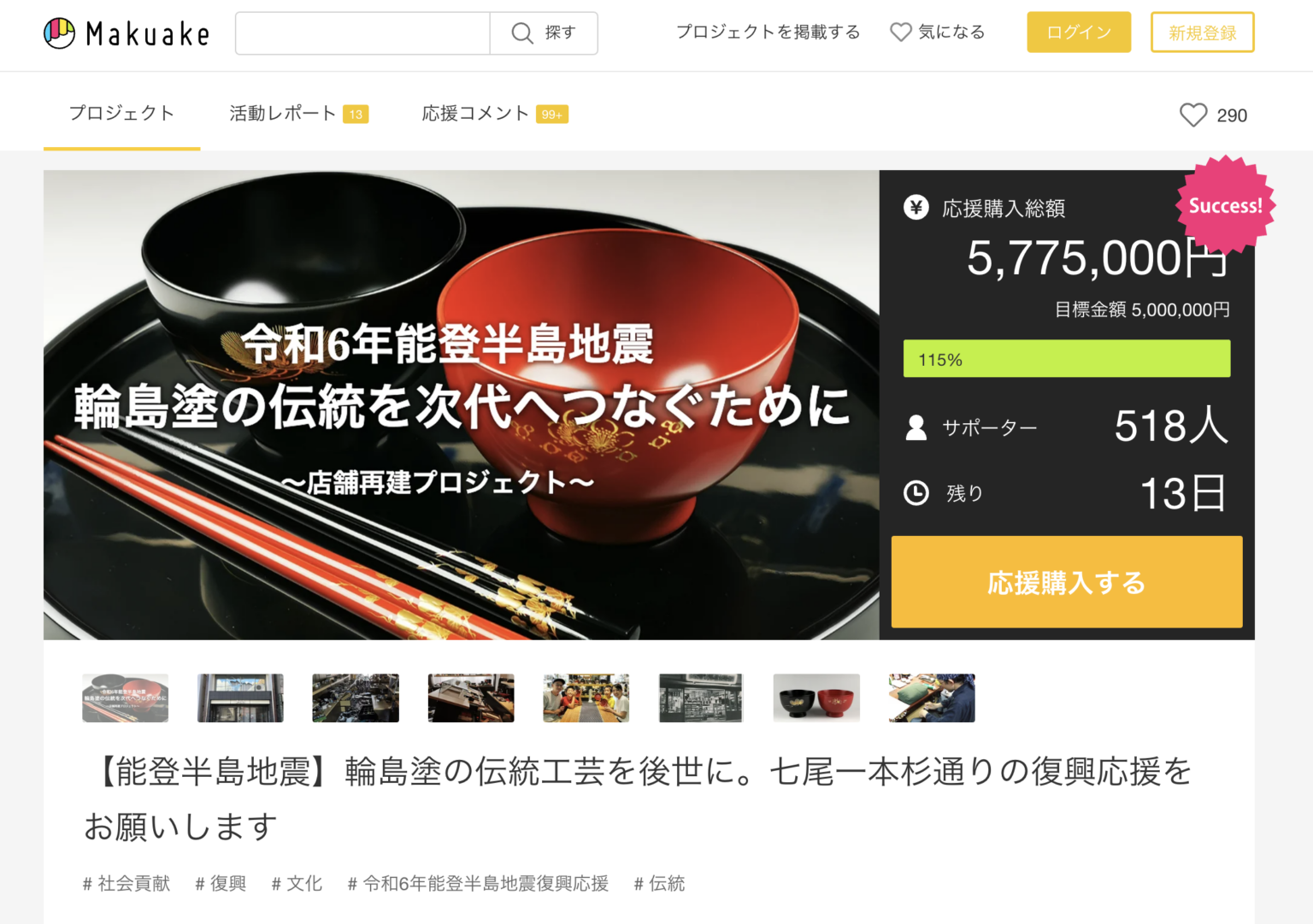 令和6年1月1日、石川県能登地方を震源とする地震が発生し、七尾市「一本杉通り」に店を構える『漆陶舗あらき』も甚大な被害を受けました。絶望の渦中にいながらも、若女将の新城さんは、「輪島塗の伝統を絶やさない」との思いを胸に、輪島塗産業の復興も描きながら、再建の決意を示しました。周りではクラウドファンディングを始めるお店も出始めておりましたが、店内の片付け作業に追われる中、自社だけでプロジェクトを立ち上げるのが難しい状況でした。