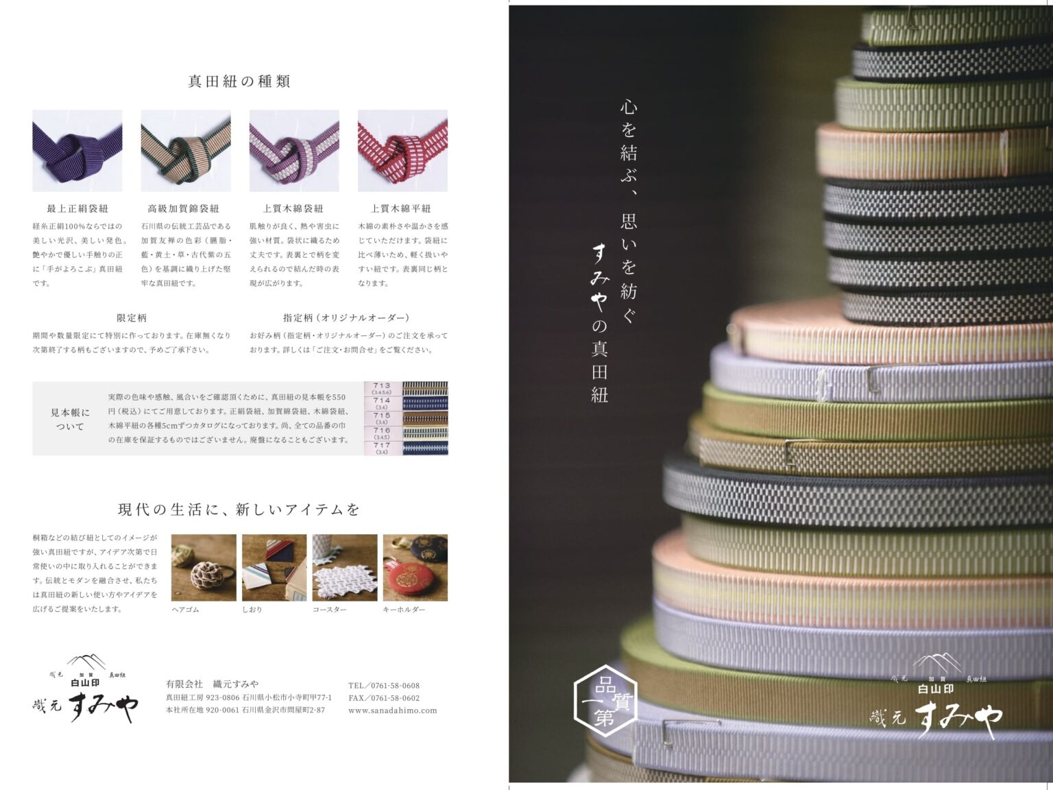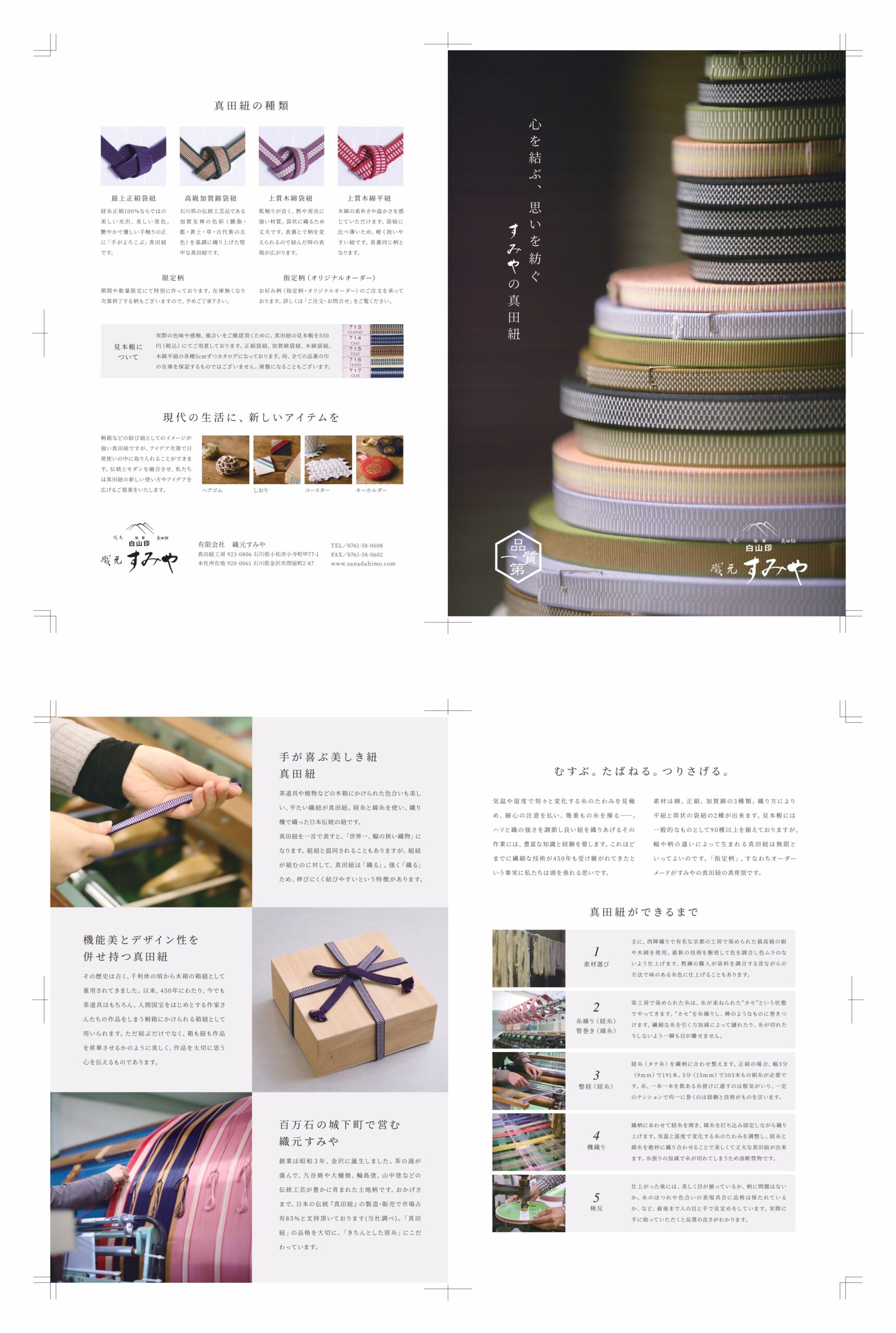 自社サイトの上品かつモダンでシンプルなトンマナを踏襲し、写真と文章が引き立つような見やすく美しいデザインを目指しました。伝えたい情報をコンテンツに整理しブロックごとに紹介。優先順位の高い情報から自然と目に入り、読みやすいフォントサイズ、文字量にて情報を届けています。表紙は格式と品質を伝える重厚さを感じる写真を大胆に使い「織元すみや=真田紐」がインパクトを持って伝わるように。また裏面に、軽やかでモダンな真田紐を素材とした新アイテムを掲載することで企業の幅をお伝えする構成としました。