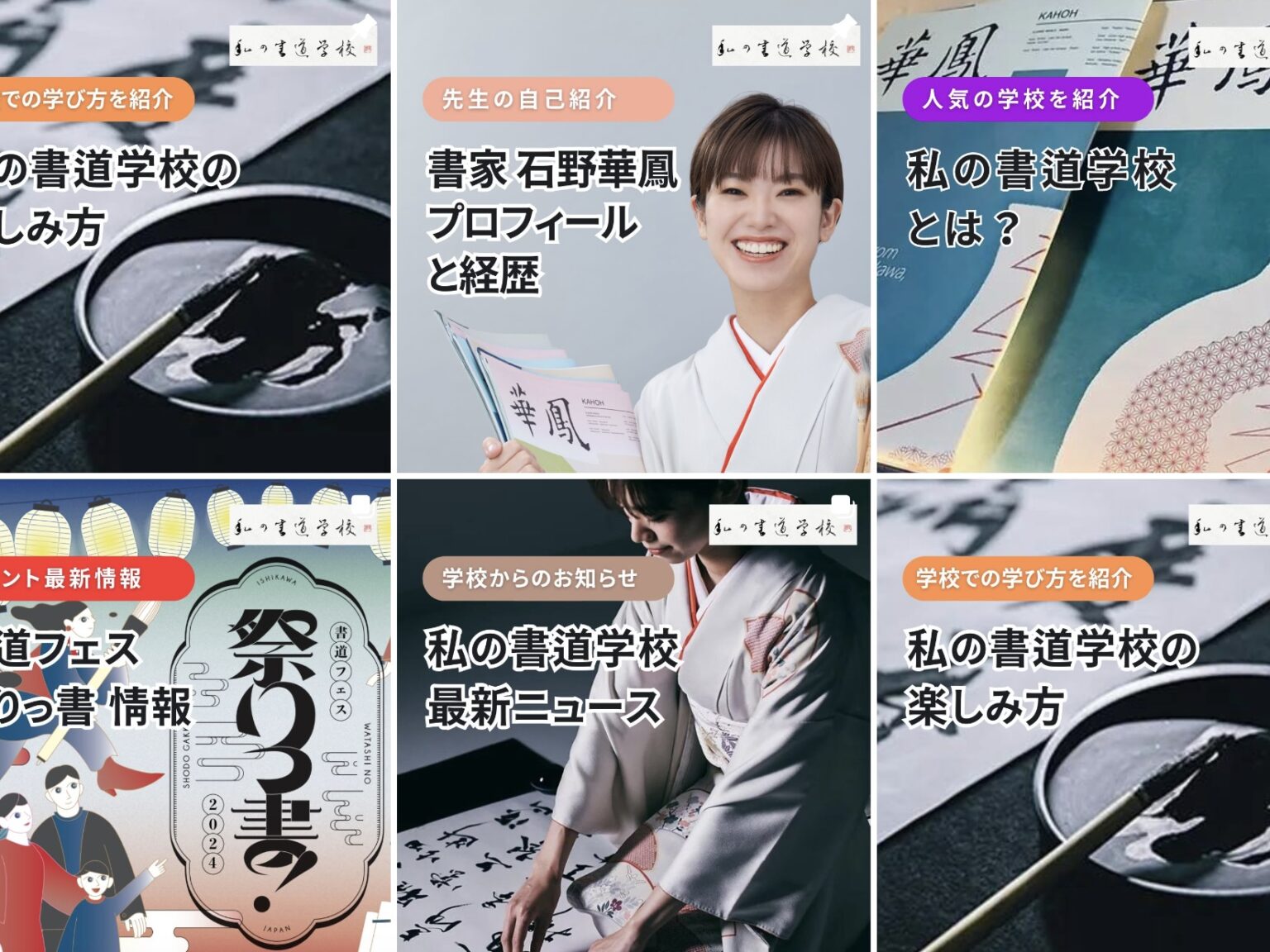 書家・石野華鳳主宰の、大人のためのオンライン書道学校『私の書道学校』。2024年9月開催予定の、同校主催の新感覚書道フェス「祭りっ書!2024」に向けて、書道の魅力をさらに幅広い世代に広げたいとの思いで、若者に親しみやすいSNS(Instagram)のアカウント開設をご検討されておりました。書道に興味がない方や、初心者の方にも書道の魅力を伝えたいのはもちろん、来たる「祭りっ書!2024」の情報を告知したい、『私の書道学校』の認知度を上げたいとお考えでした。Instagramの利用が初めてで、アカウント開設から、投稿内容の提案・制作までお願いしたいとご希望でした。