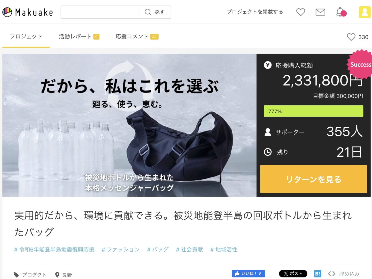 「アースグリーンマネジメント」様は、長野県でペットボトルのリサイクル業を営む企業で、全国から集めたペットボトルを高品質なリサイクル素材に生まれ変わらせています。令和6年の能登半島地震を受け、取引先企業があるご縁から、被災地支援の方法を模索しました。その結果、被災地および避難所から回収したペットボトルをリサイクルし、バッグを作成する支援プロジェクトを発足。完成した「100%ペットボトルリサイクル・バッグ」は、環境保護と被災地支援の象徴としての役割を担い、ただの商品の枠を超えるものになりました。プロジェクトは、能登の被災地のために何かしたいという若い世代の思いが込められており、収益を全て寄付し、復興に貢献するスキームとなっています。支援やアコアクションと大上段に構えず、「おしゃれだから使いたい」というモチベーションで気軽に取り入れられることも重視。どんなシーンでも使いやすい洗練されたものとなっています。バッグを手にすることで被災地応援とエコ活動に参加できることを訴え、新しい形の支援活動として広く認知されることを願い、『Makuake』への挑戦を決意されました。