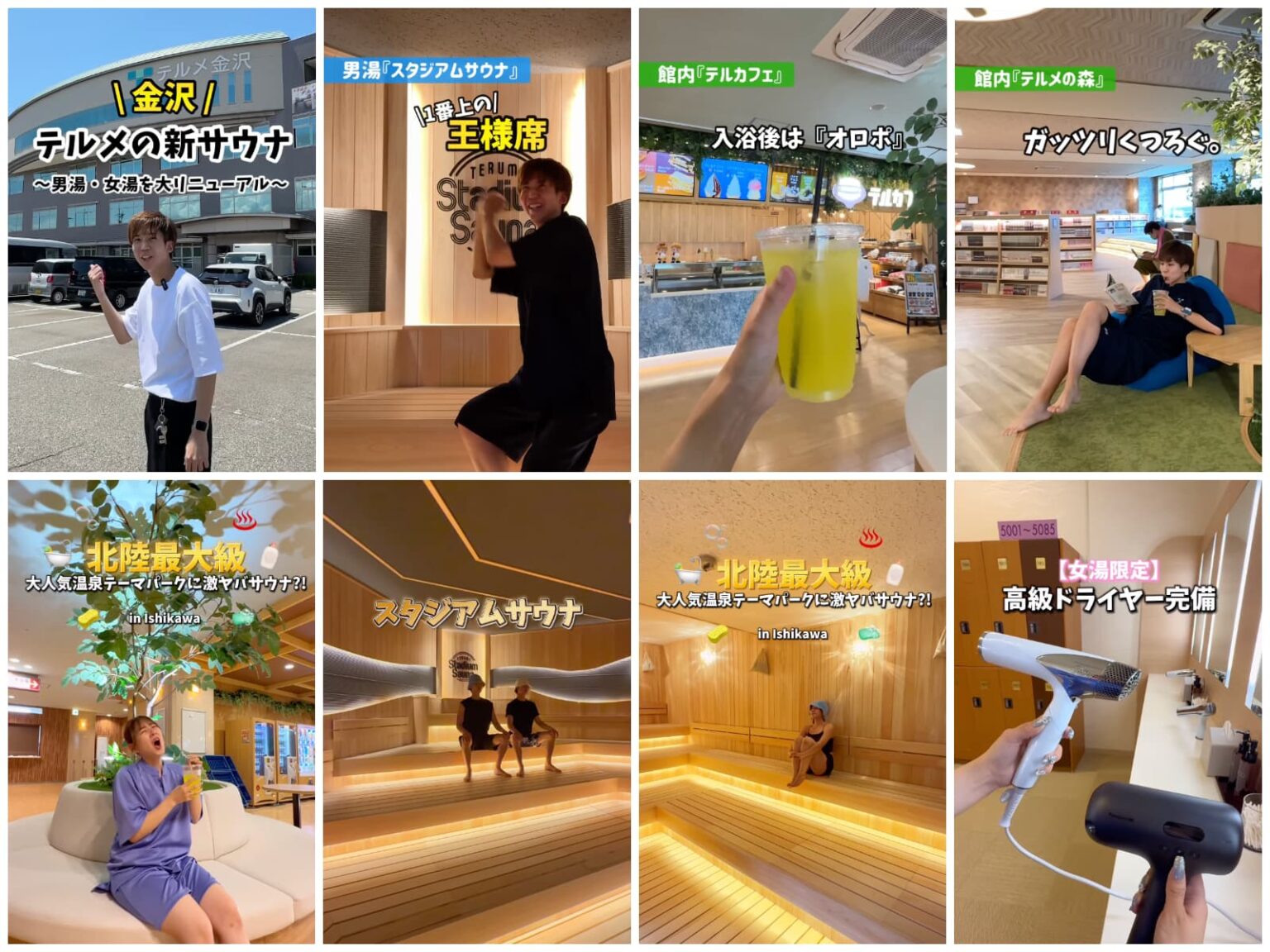 前回のリニューアルでも好評だったインフルエンサー施策を、今回も継続的に展開。施設の“おしゃれで楽しい”雰囲気を可視化し、20代〜60代まで幅広い世代への訴求を意識しました。前回は、来館者数・売上ともに前年同月比125%を記録し、若者やファミリー層の来館が増加するなど、ターゲット層の拡大に成功。今回はその実績を踏まえ、北陸エリアで高い影響力をもつ「べこりぃ」さんと「ほくたび」さんを起用しました。 2名による体験投稿では、リニューアルしたサウナや脱衣所の魅力をわかりやすく紹介し、共感を呼ぶ内容に。リアルな体験を通じたコンテンツは多くのユーザーに届き、SNS上での好意的な反応を獲得。CMや他のインフルエンサー起用やSNS投稿の強化も併せた結果、テルメ金沢の公式Instagramアカウントはリニューアルを機に1万人フォロワーを突破し、大きな節目となりました。オンラインとリアルを結びつけた今回のプロモーションが、施設のさらなる魅力浸透に寄与する形となりました。