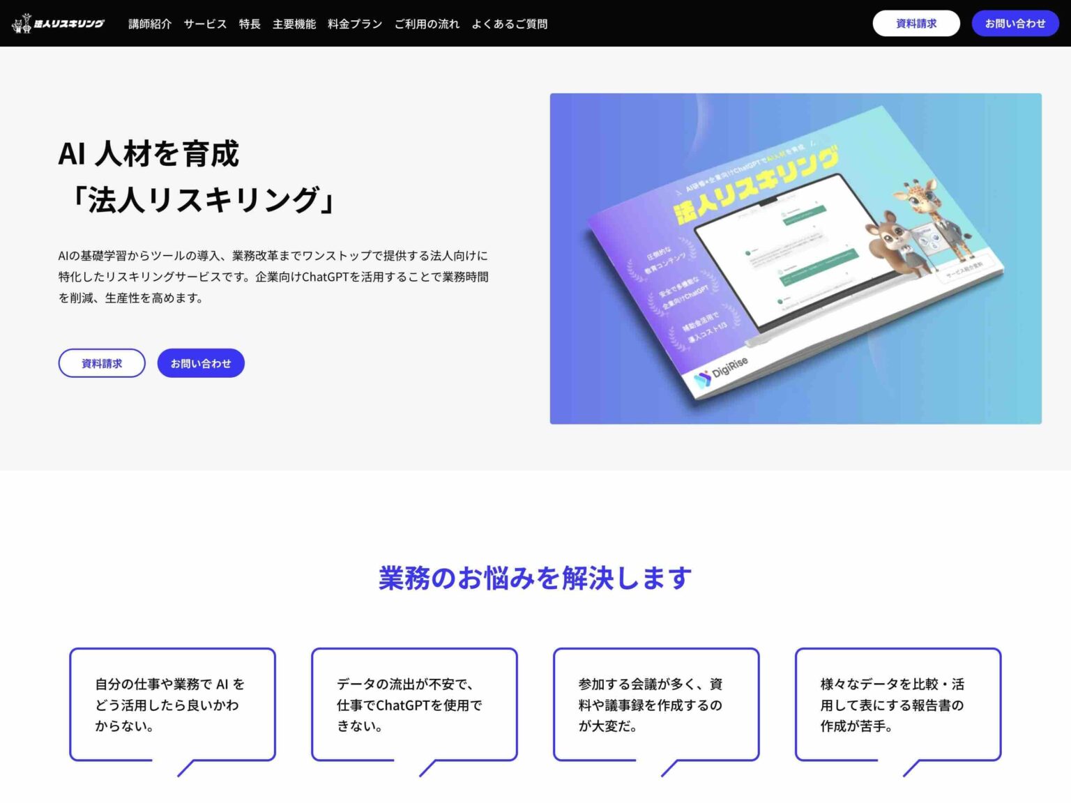 金沢市内の『株式会社チェンジプロモート(柏野経営グループ)』様は、起業や海外展開など、企業のお悩みに寄り添ったサービスを提供している会計事務所です。今回、企業の業務効率向上という課題解決の提案策として、これからの時代に必要なAI人材の育成に特化したサービス「法人リスキリング」を『株式会社DigRise(デジライズ)』と提携して提供することに。今後、北陸で当サービスを広めていくため、基本的なサービス内容の紹介や料金、お問合せなどの機能を備えたホームページを短時間で作成することが目下の課題でした。