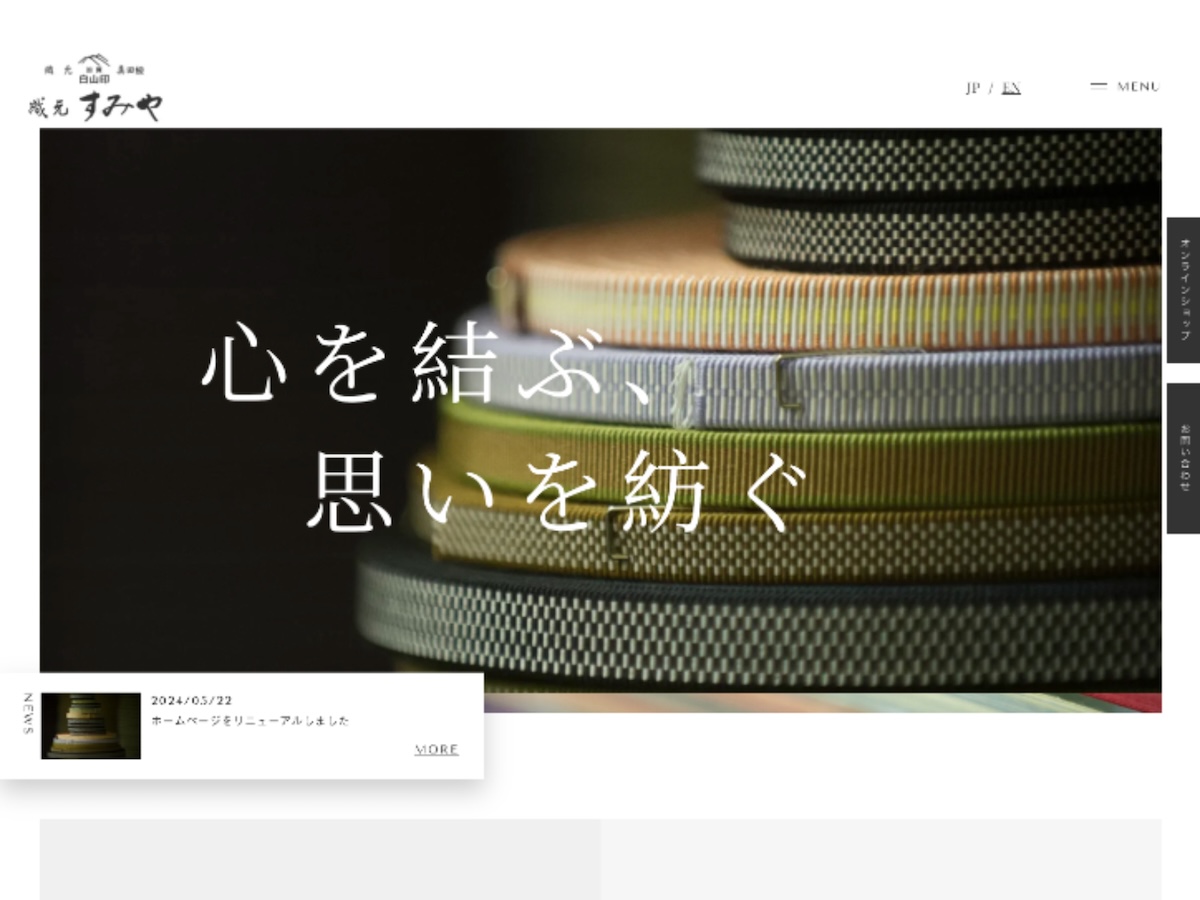 上質な真田紐の印象に合う、落ち着いた雰囲気のシンプルなデザインをご提案しました。余白を生かし、写真が引き立つテンプレートを採用し、真田紐を知らない人が見ても、直感的に美しいと感じるような仕上がりを目指しました。同時にパンフレットなどの自社ツールを作成することが決まっていたため、写真を新たに撮り下ろしました。品質、職人技、美しさなどが伝わる抒情的な写真を効果的に用いて、次が見たくなるサイトを目指しました。また検索した際には上位に表示されるように、CMSを組み込み、情報を更新していただけるように。チェックするたびに新情報がアップされている、生きたサイトを目指せるようになりました。