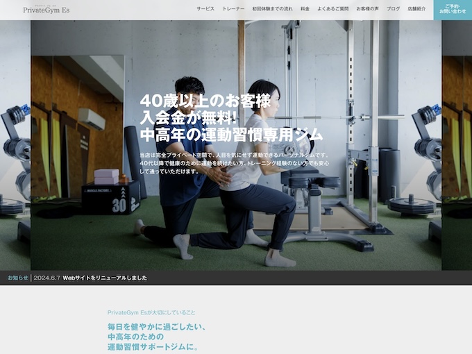 『PrivateGym Es (プライベートジム エス)』様は石川県金沢市に4店舗、富山県富山市に1店舗を構えるパーソナルジム。“中高年の運動習慣専用ジム”をコンセプトに、完全予約制のプライベート空間でお客様一人ひとりの目的に合わせた運動を行えます。元々ホームページはお持ちでしたが、レンタルサーバーのテンプレートだったため、1ページあたりの情報量が非常に多くやや見づらい印象に。「パーソナルジム未経験者や運動初心者の方にも、敷居の高さを感じずに体験を申し込みたくなる」新サイトを、できるだけ短期間で作成されたいというご要望をお持ちでした。