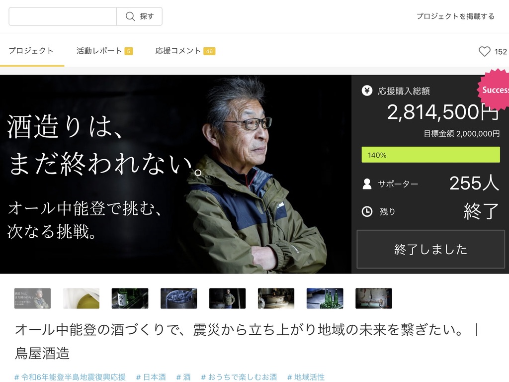 ヒアリングにお時間をいただき、鳥屋酒造様の状況と自助努力の必要性を正しく理解し、プロジェクトの軸に「事実を伝えること」を据えました。6人の蔵人による丁寧に仕込まれた「真心の酒」であることを強調し、400本限定の希少性をアピールしました。蔵の歴史、酒造りや原料へのこだわりを丹念に聞き取り、復興への強い意志を物語として構成。また、重厚感を大切にしつつ未来に向かう意欲や意志を伝える写真を配置し、心情や真摯な取り組みを伝える内容に仕上げました。その結果、目標金額2,000,000円に対し、2,814,500円(140%)の支援を集め、復興に向けた大きな一歩を踏み出すことができました。